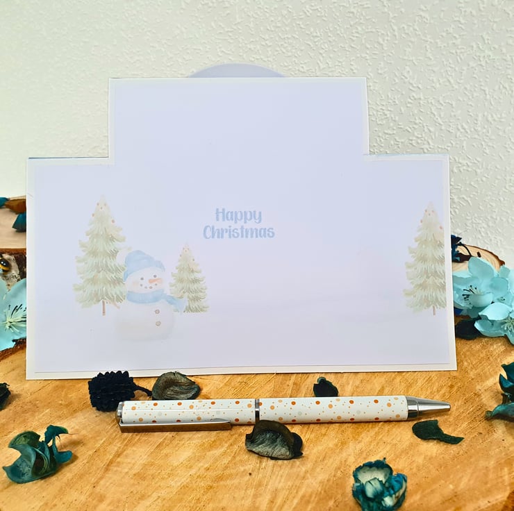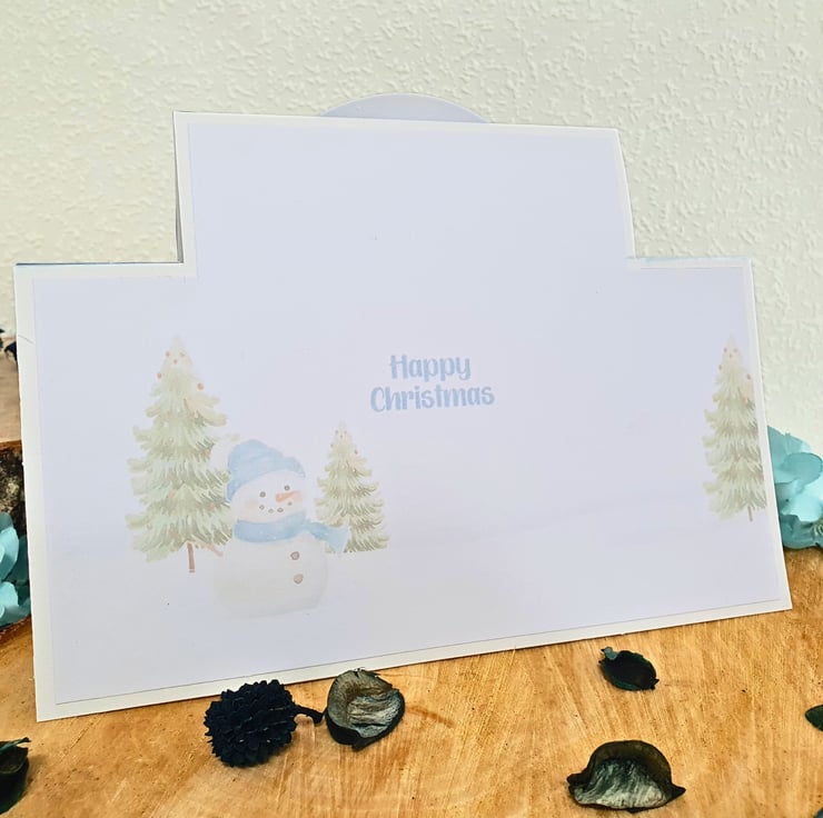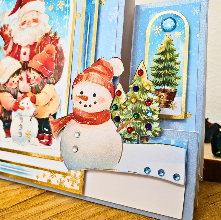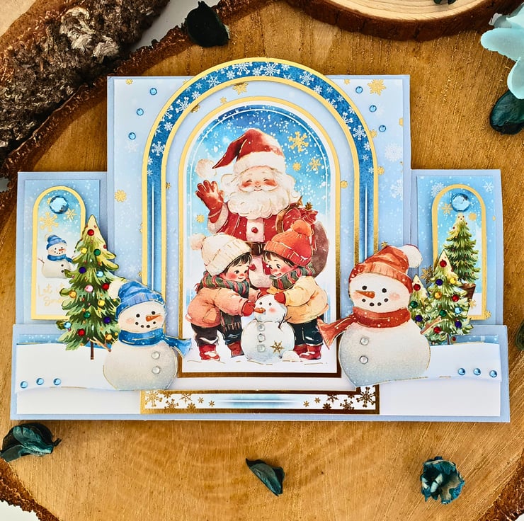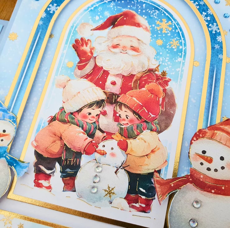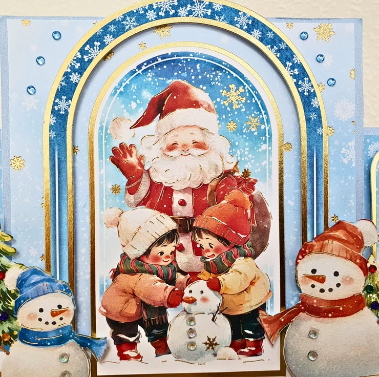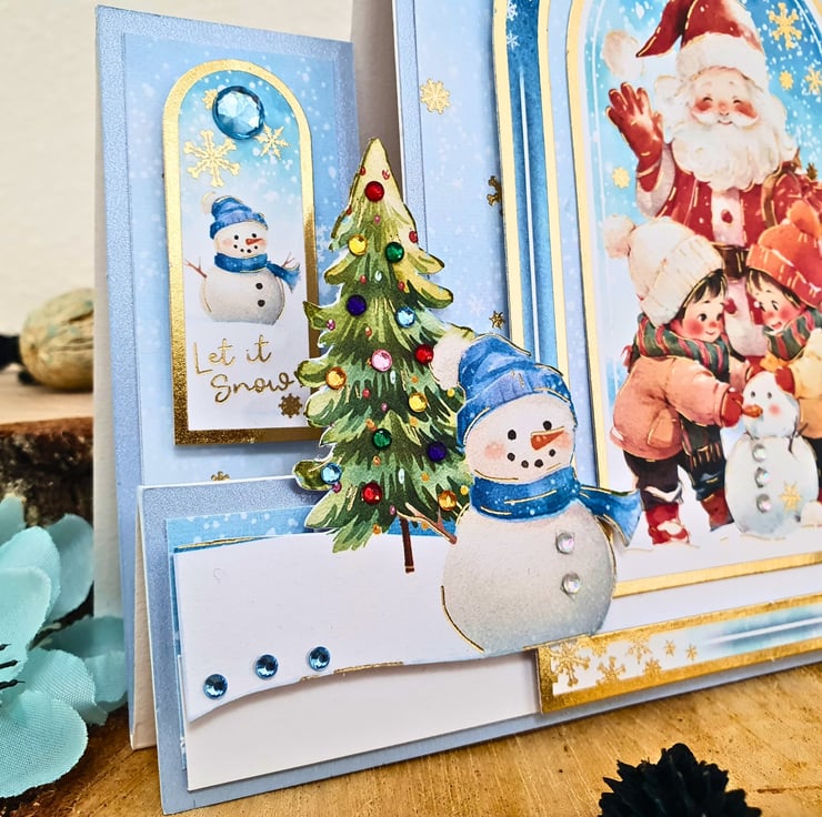 It consists of white card base layered with cashmere blue pearlescent card & printed cardstock with a snowy sky pattern & gold foiled snowflakes. The main arch topper lays in the middle of the card & displays the festive image. The 2 steps either side of the topper are embellished with gold foiled tags, one showing a Christmas Tree & the other a snowman with the wording "Let It Snow". Two panels with a snowmen and Xmas Trees are placed either side of the topper, raised for dimension. The card is finished with coloured diamante to represent the baubles on the trees. Matching insert at the back, stamped with the wish "Happy Christmas". An absolute jewel for your Christmas display!