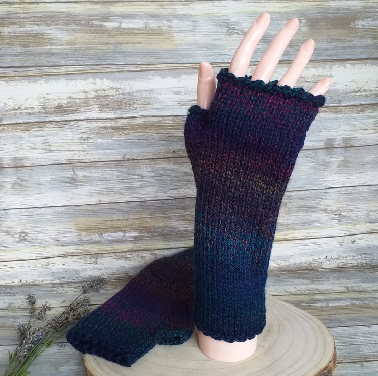 A pair of knitted fingerless gloves made with a premium marbled acrylic yarn in shades of Magenta, Purple and Green called ‘Moody Skies’.