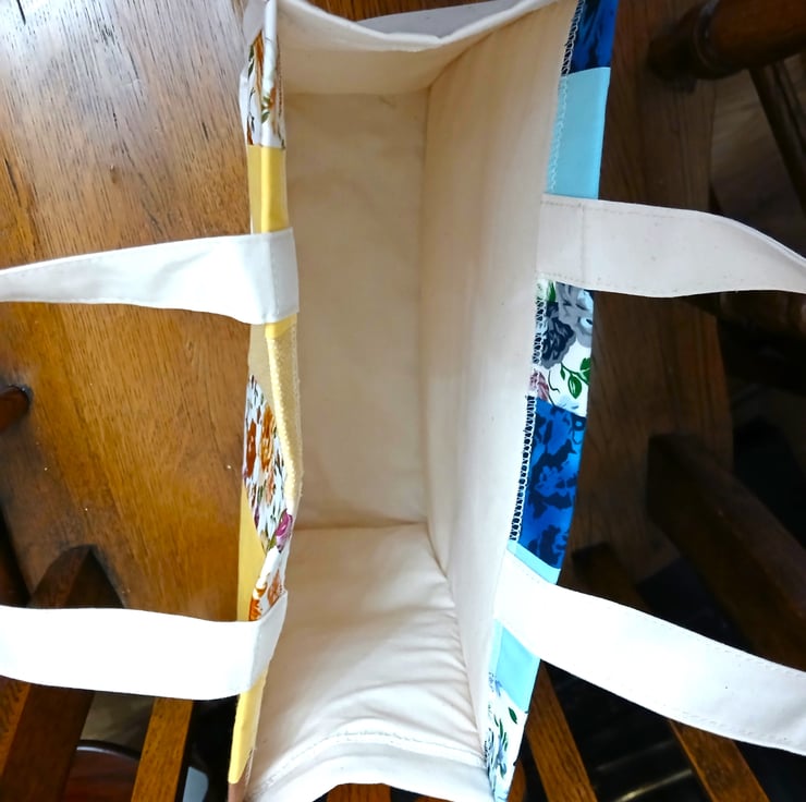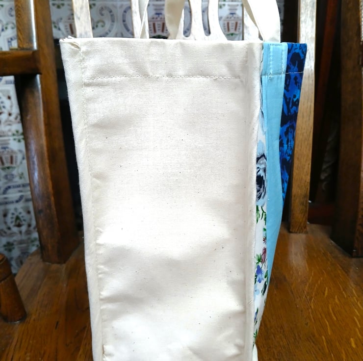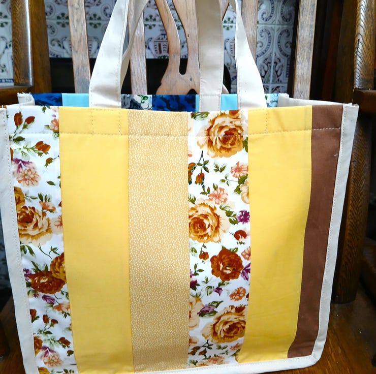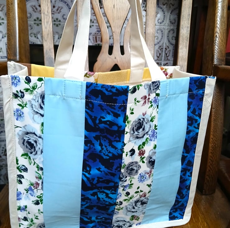 Bags, Small Shopper in Blues, Yellows and Browns Cotton fabric. This bag is interfaced to give it structure and is lightweight. One side is made from yellow and brown striped fabric and the other side is made from a combination of blues. The inside ,sides, base and handles are made from calico cotton fabric.
