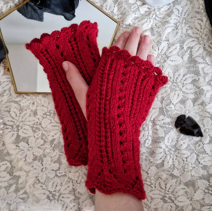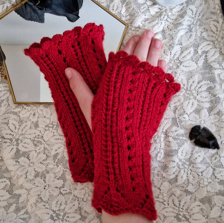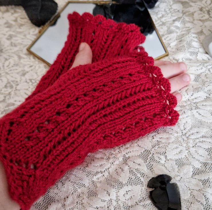 Add some vintage glamour to your outfit with our elegant, red gothic lace fingerless gloves. Featuring frills and lacework characteristic of Victorian neo-Gothic accessories, these hand knitted, blood red gothic gloves are the perfect finishing touch to a vintage, or steampunk inspired outfit!