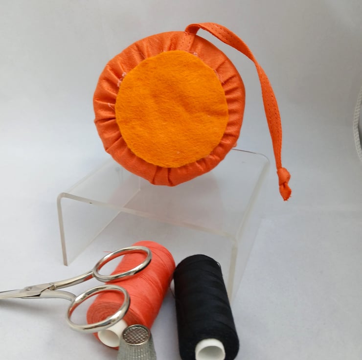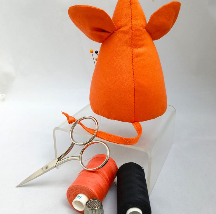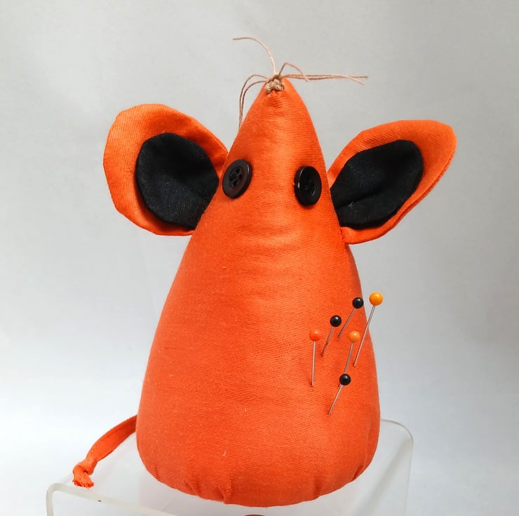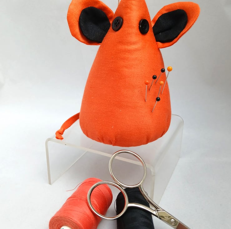 Pin Cushion, Mouse in orange and black. Novelty Mouse pin cushion in orange cotton with black buttons for the eyes and black cotton fabric for the inner ears. Cotton whiskers.
