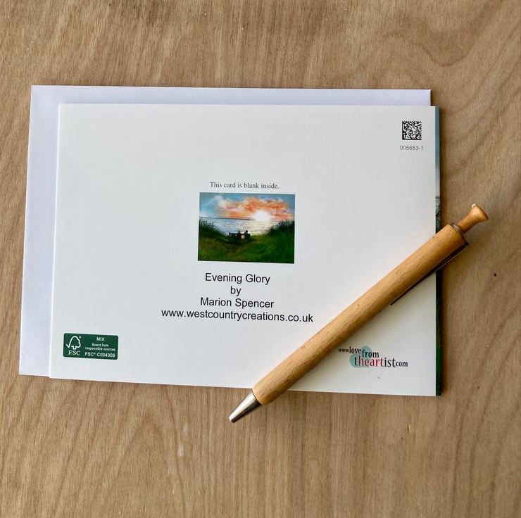 Sitting on a bench watching the sunset over the sea, a card for many uses.Price includes UK second class mail. Evening Glory is an original digital painting by Marion Spencer. Posted to you in a cardboard backed envelope or can be hand written and sent direct to another recipient for no extra charge.