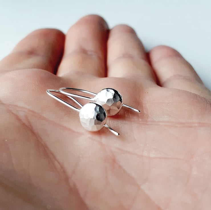 Handmade in my workshop, melting recycled sterling silver into a ball hammering into shape, using a ballpein hammer to add the dimple texture, soldering on a sterling silver hook wire and finally polishing the little stud earrings.