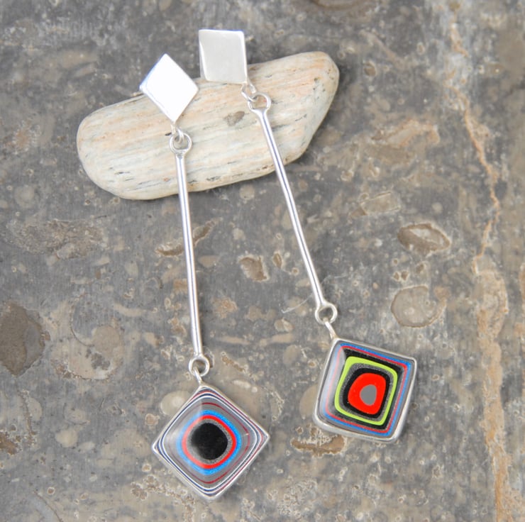 These long earrings have diamonds of fordite suspended at the bottom of a silver 'stick', the top of the earring has a diamond shape of silver which hides the post and scroll. The earrings measure 70mm top to bottom by 19mm across (fordite is 14mm along each side). The fordite is not a matched pair however they both have rings of bright colours (red, green and blue) on a base of dark grey and black. Fordite is lightweight so they would be comfy to wear all day and come in a gift box.