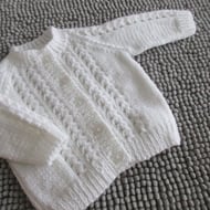 The cardigan has ribbed welt front bands and a neckband