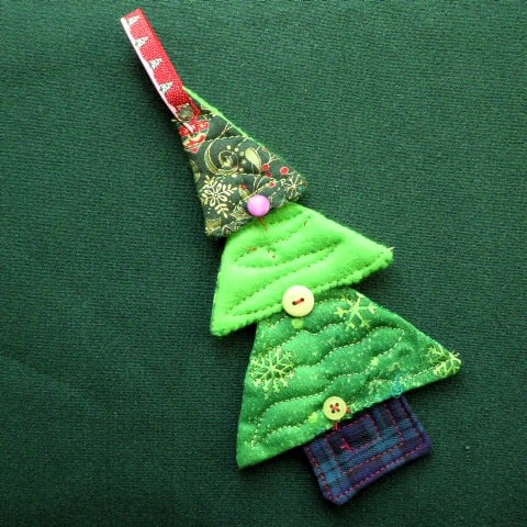 Christmas fabric, hand stitched button decorated, tree shapes.