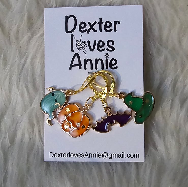 This is a set of 4 bright and colourful Halloween themed stitch marker / progress keepers