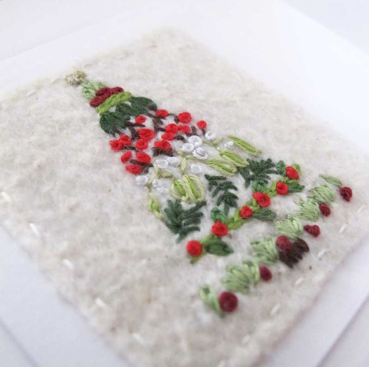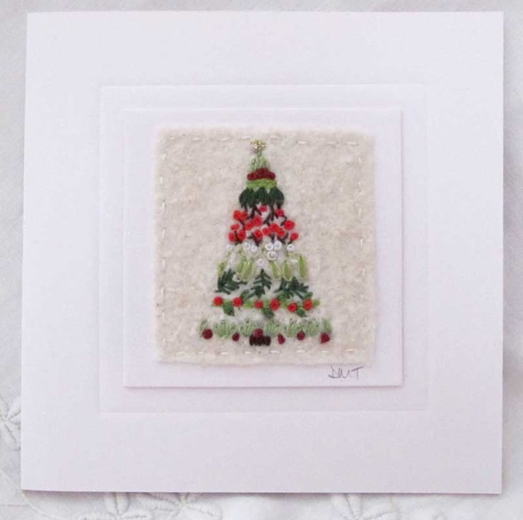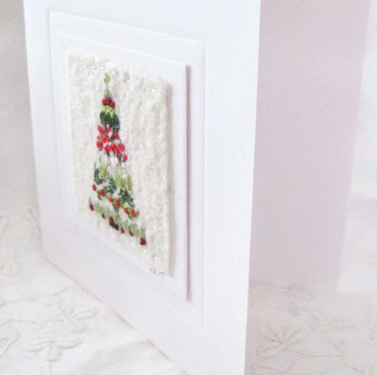 This beautiful card has been embroidered by hand onto a soft wintery fleece fabric. The design is a triangular Christmas tree shape filled in with embroidered foliage including Mistletoe, pine needles, leaves and red berries - perfect for a special card, or perhaps framing it as it is. It has been mounted on a card base and is surrounded by an embossed square. The card has been left blank for your own message.