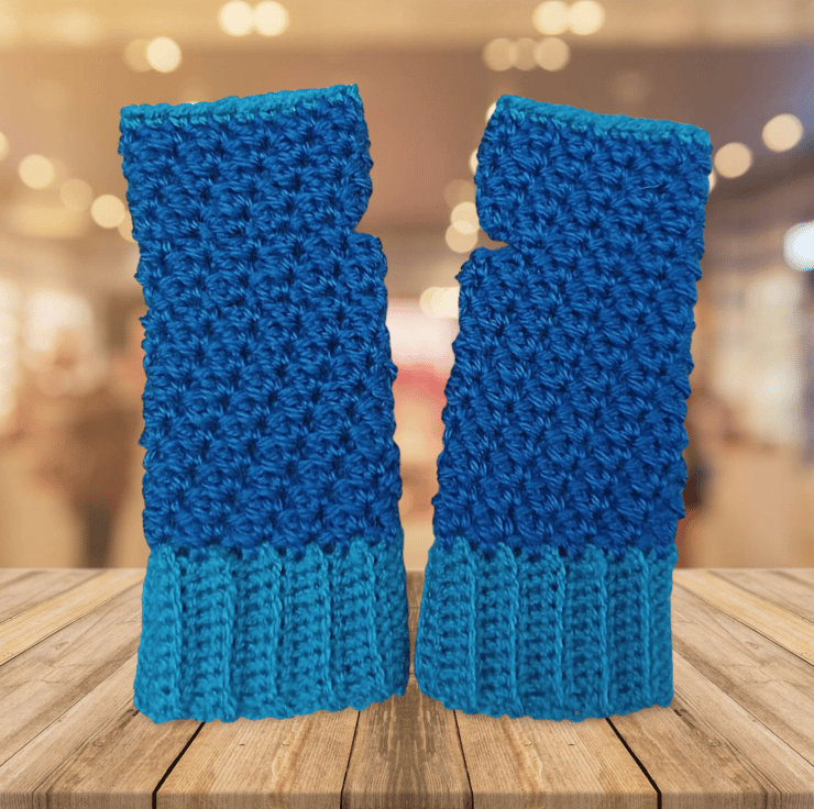 Crocheted wrist warmers or fingerless gloves in blue with a petrol cuff and edge.
