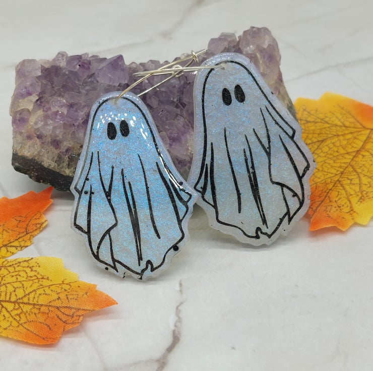 Get ready to haunt the halls in style with these Halloween ghost hoop earrings. Crafted with epoxy resin, coloured with colour change glitter, these whimsical ghostie silhouettes add a touch of spooky glam to any look. These earrings are perfect for everyday wear, from the office to a Halloween party. Whether you're shopping for yourself, or seeking the perfect gift for the Halloween lover in your life, these are sure to become a seasonal staple.