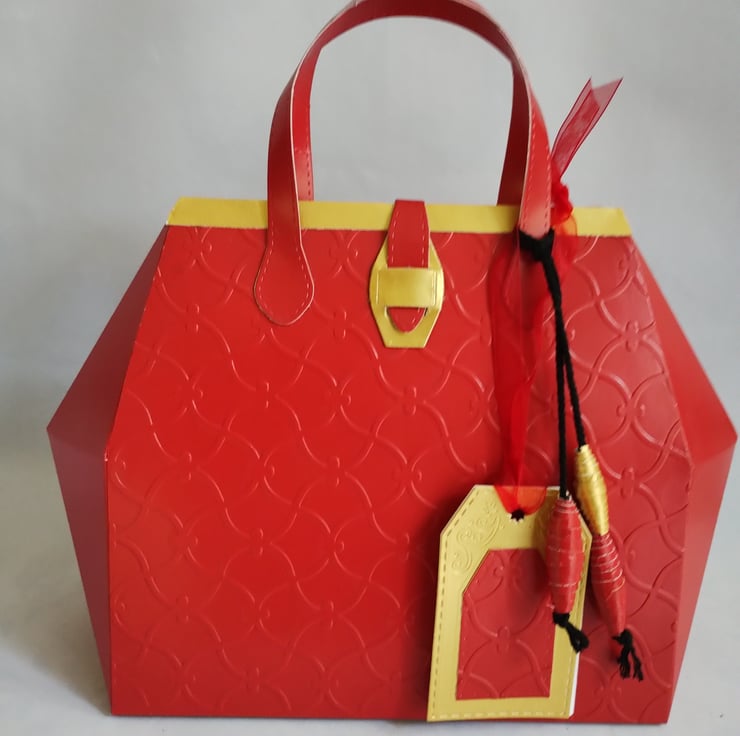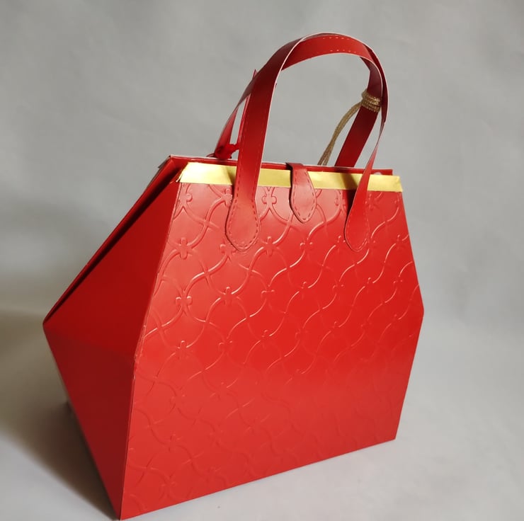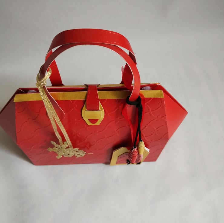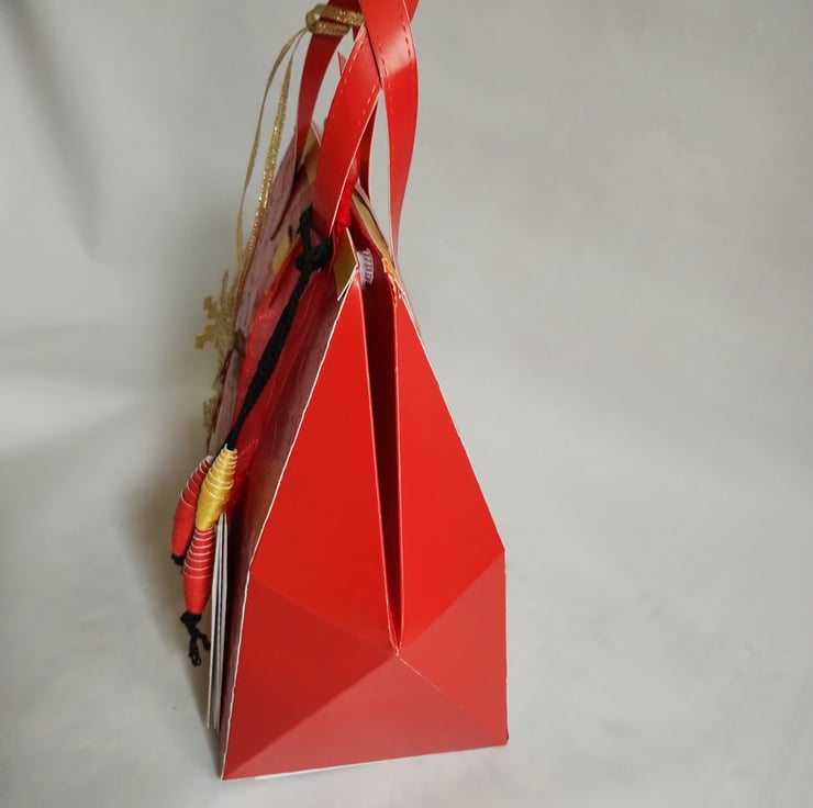 This is a vibrant red and gold gift box bag made in the style of a 1950s handbag. The premium quality cardstock is embossed with a curly trellis pattern and trimmed with gold top and faux fastener. There are a couple of gold glitter snowflakes (which can be removed so the gift bag can become a long lasting keepsake) and matching paper beads tied with thick black twine and gift tags, tied with red organza ribbon, for you to write your message.