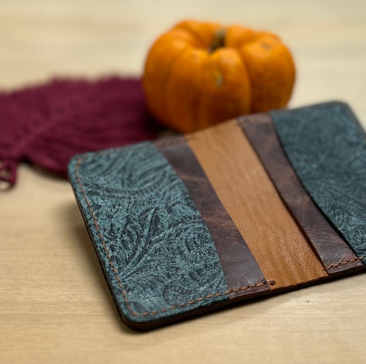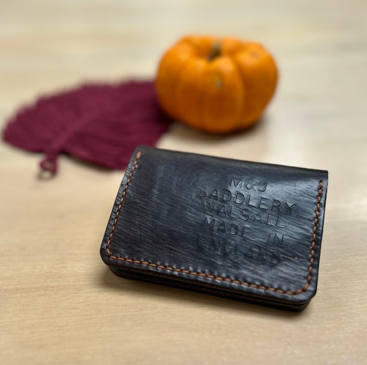 Bifold wallet with 5 pockets for cards and cash would make a great gift for a horse lover. The exterior leather is repurposed from a beautifully aged vintage saddle, I’ve kept the original stamp M&J Saddlery Walsall Made in England on the reverse. The interior is lined with the softest tan leather and the interior pockets are a brown pull up and blue embossed paisley leathers all from a British tannery.