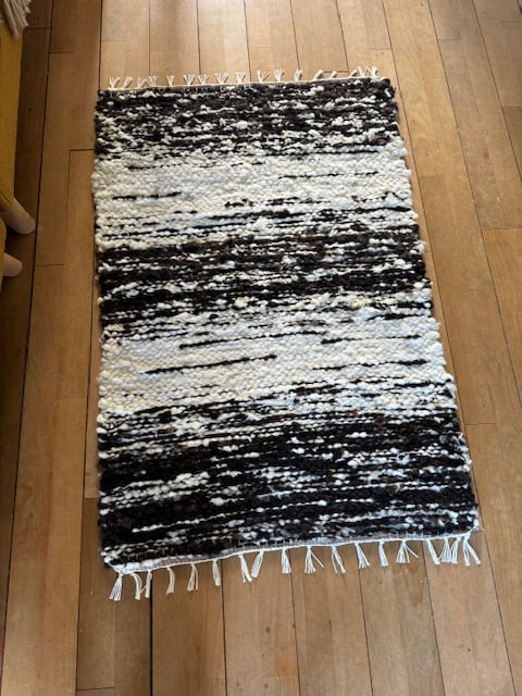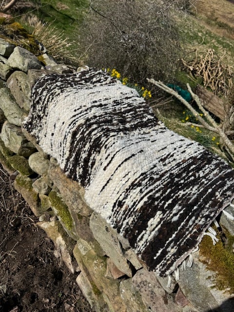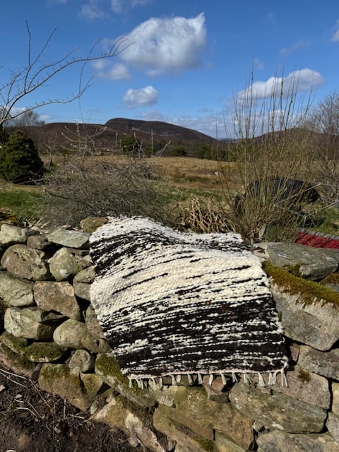 All my rugs are hand processed from dirty fleece, off the sheep's back, through to finished item. I pick through, spin, wash, weave, all by hand, using local fleeces from nearby crofts. I take pride in using vintage equipment and also very modern techniques and equipment too, from hand spinning and weaving on vintage wheels and looms, to using my e spinner for the super chunky yarn I use for my rugs.