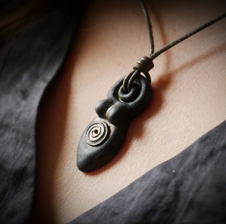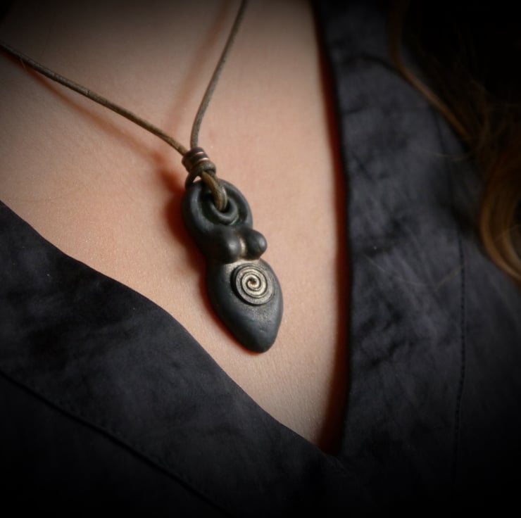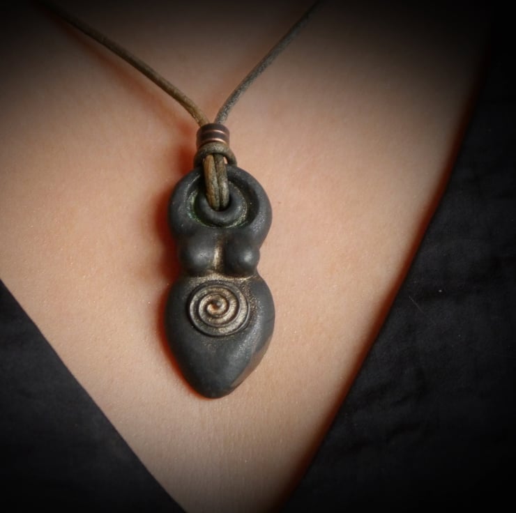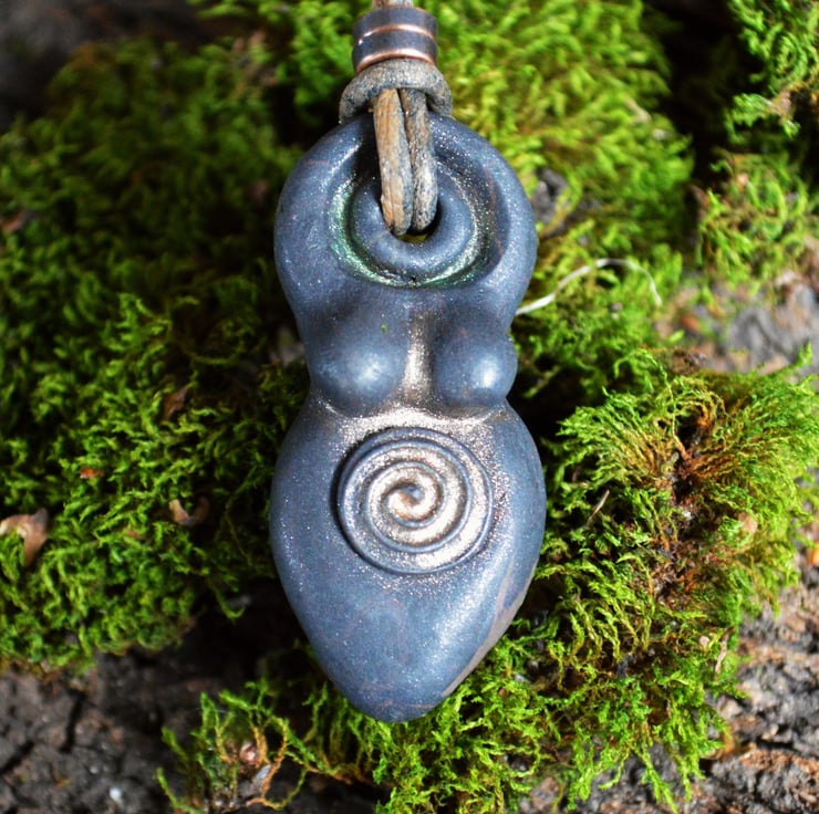 This Beautiful Goddess pendant has been made from Polymer clay she measures approximately 1 12 (5cm) and has a spiral on her belly a antiqued leather necklace 10 (25cm) from pendant to clasp and two copper beads.