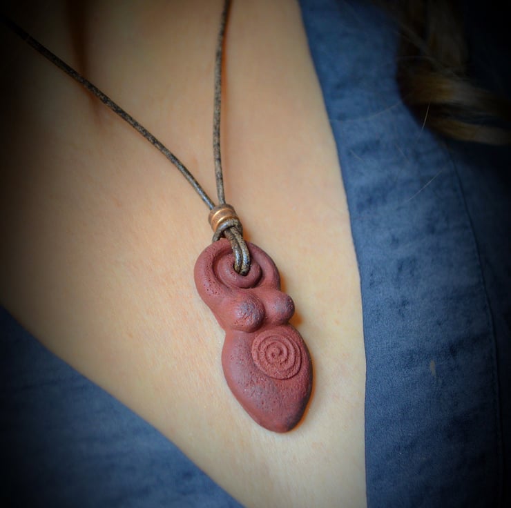 This Beautiful Goddess pendant has been made from Polymer clay she measures approximately 1 12 (5cm) and has a spiral on her belly a antiqued leather necklace 10 (25cm) from pendant to clasp and two copper beads.