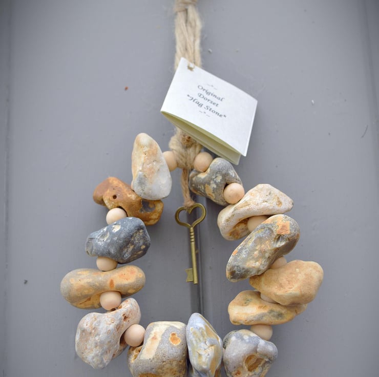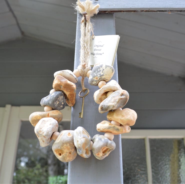 This beautiful Hag Stone door Wreath Charm measures approx 5 12 in diameter it has been adorned with wooden beads and Dorset Hag stones in the centre is a protective key talisman. it will be presented wrapped in Stamped tissue paper with an information card making this a perfect Gift for a friend or a special treat for yourself!