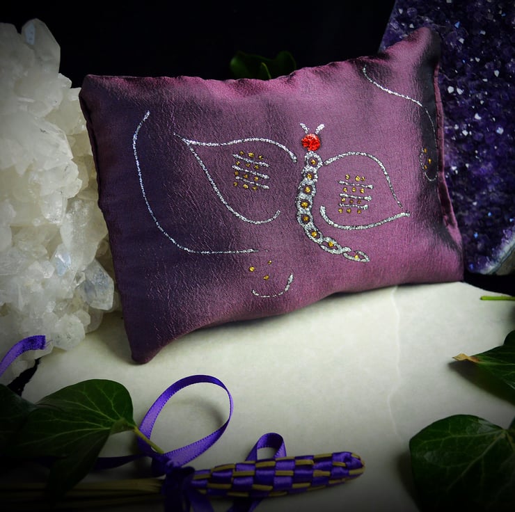 This Beautiful Dream Pillow is Handmade and filled with a blend of Herbs and Essential Oils including Lavender and Lemon Balm to help releive Stress and bring Peace. I have also included some tiny pieces of Rose Quartz and Amethyst crystals to calm and bring peaceful sleep.