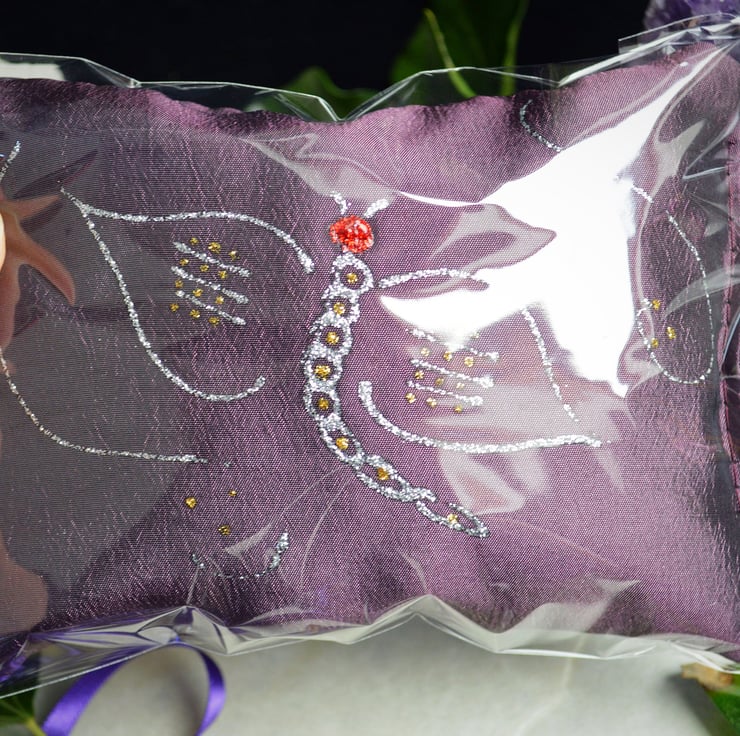 The Pillow is 5 12" by 4", comes in its own cellophane bag to retain the aroma and has been Hand Decorated with a Lovely Dragonfly motif.