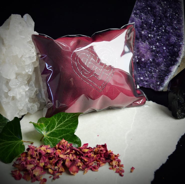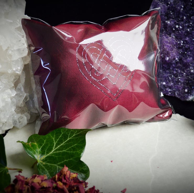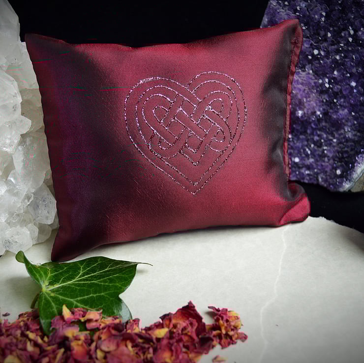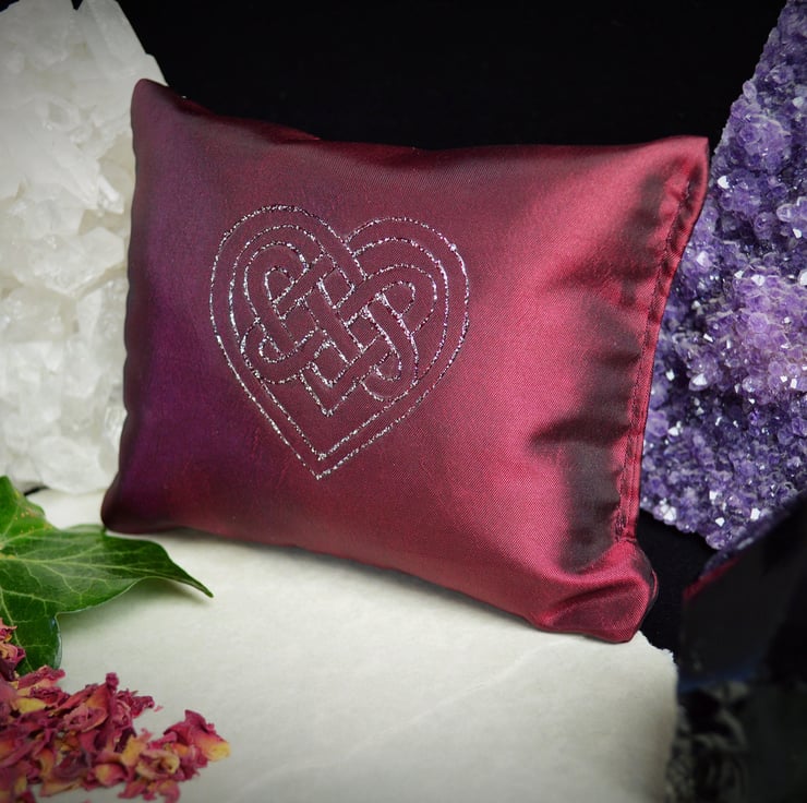 The Pillow is 5" by 4" and has been made in a red shot taffeta silk. It will come in its own cellophane bag to retain the aroma and has been Hand Decorated with a beautiful Celtic Heart motif.