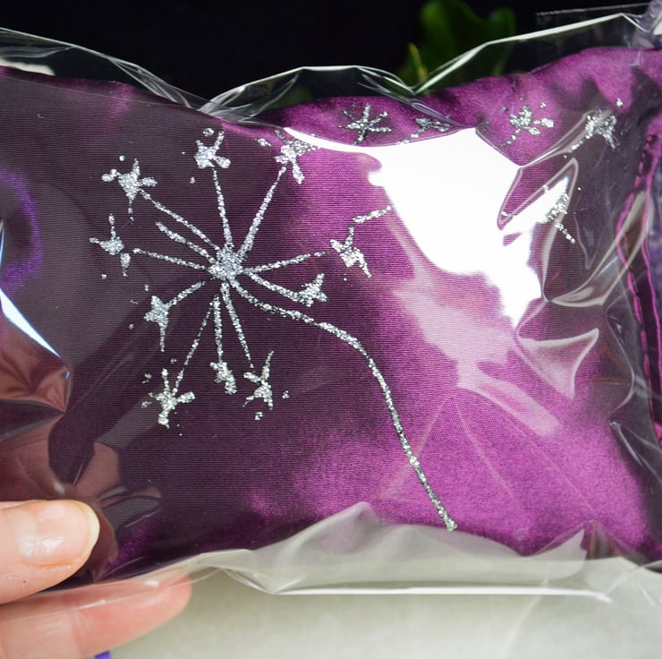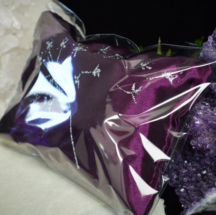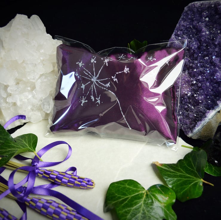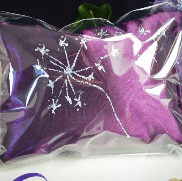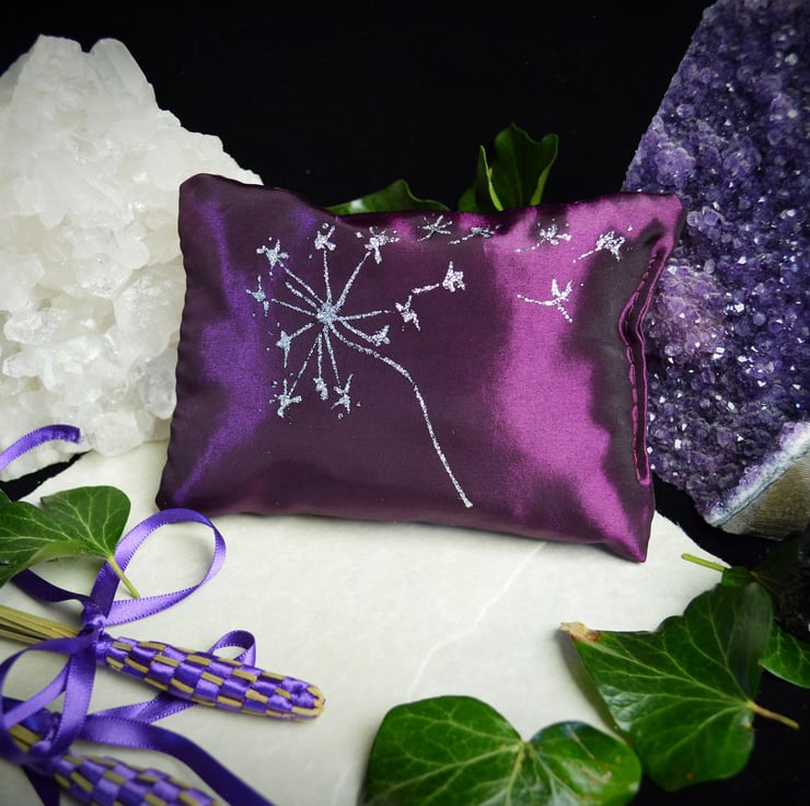 The Pillow is 5" by 4" and has been made in Purple silk taffeta. It will come in its own cellophane bag to retain the aroma and has been Hand Decorated with a Lovely Dandelion motif.