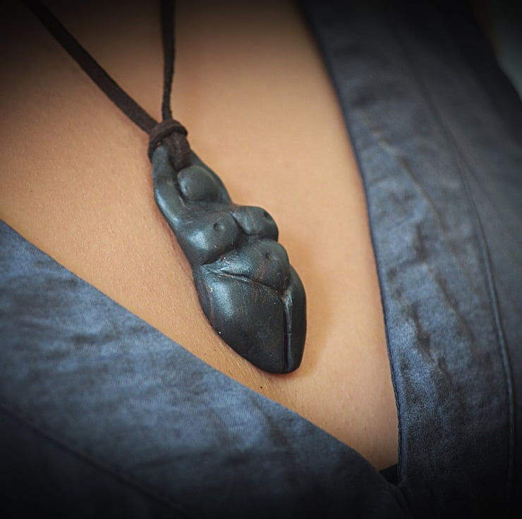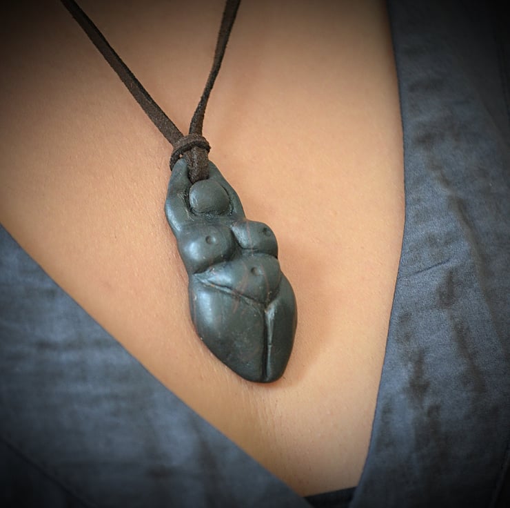 This Beautiful Goddess pendant has been made from Polymer clay she measures approximately 2 (5.5cm ) and has been finished with an aged ebony effect finish. The necklace is made from faux suede and is approximately 9 (23cm) from pendant to clasp.