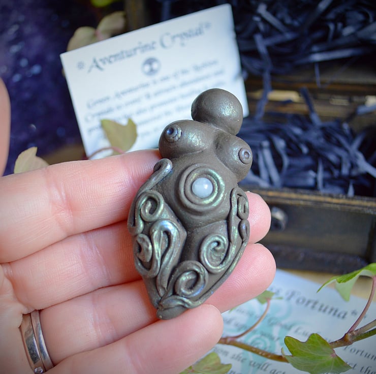 This Goddess has been handmade from clay in her belly is an Aquamarine crystal for serenity and relaxation , she is the Roman goddess Fortuna, The goddess of good luck and fortune. She can be placed upon your altar to attract these qualities and used in spells for success and prosperity. Carried on the person she will act as a lucky talisman and bring abundance!