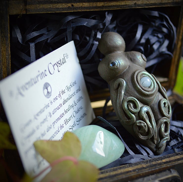 She will come with an Aventurine crystal one of the luckiest crystals to own! It Attracts abundance and prosperity, but also promote healing and calm. It is also connected to the heart chakra. Carry with you or add to spell sachets.