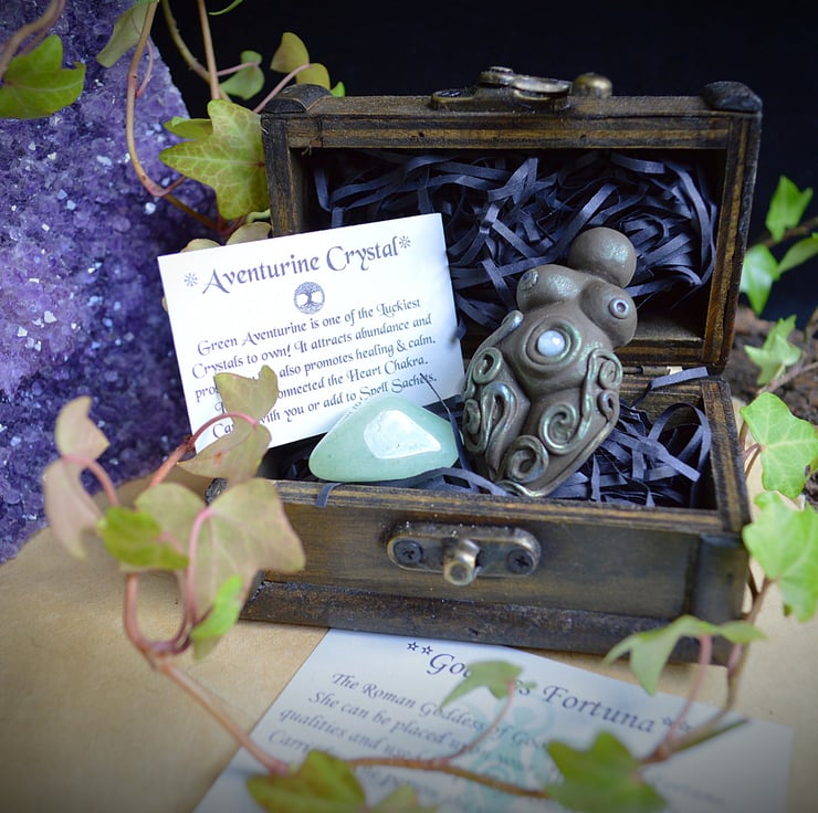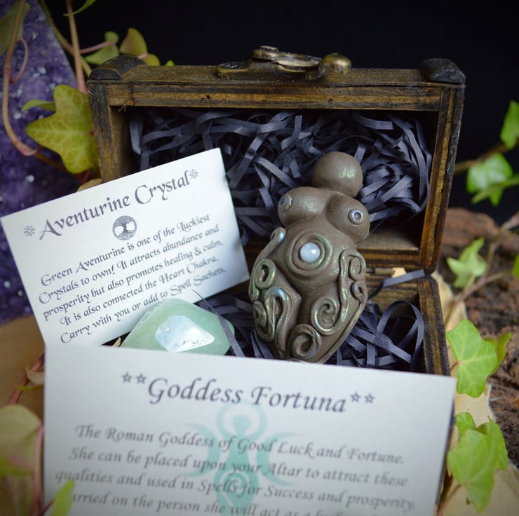 She will be presented in her own wooden chest with two information cards on The goddess Fortuna And the properties of aventurine Crystal making her a perfect Gift for a friend or a special treat for yourself!