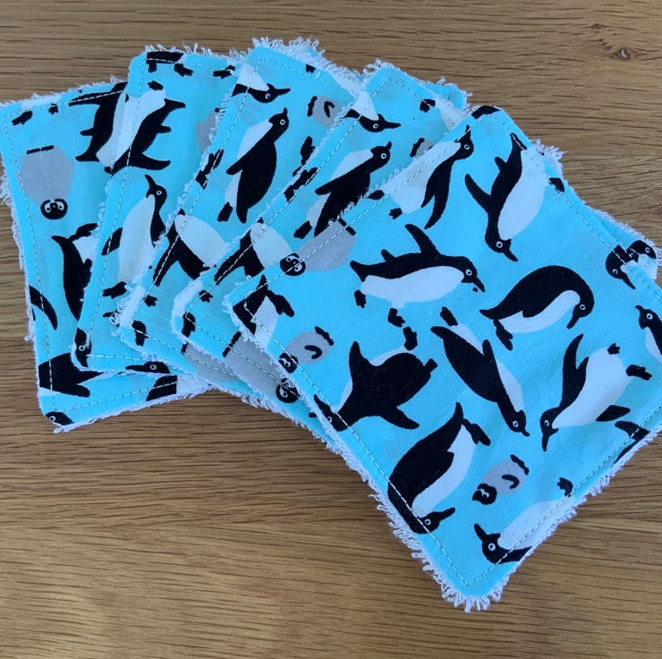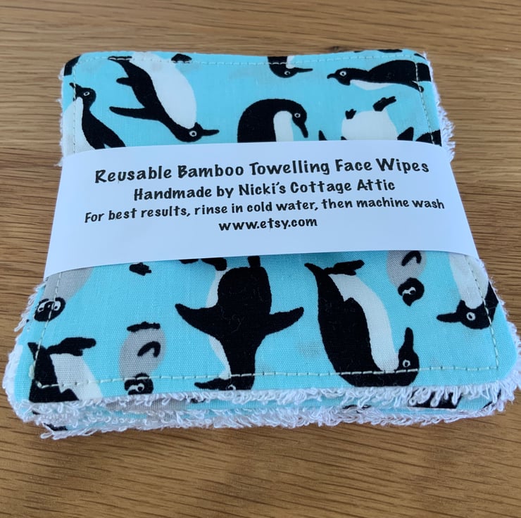 Reusable cotton bamboo face wipes, 100% patterned cotton with white bamboo towelling on reverse. Each pack contains five wipes.
