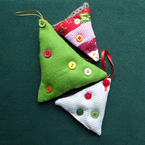 Christmas fabric designs patchworked and hand stitched button decorated tree shapes.