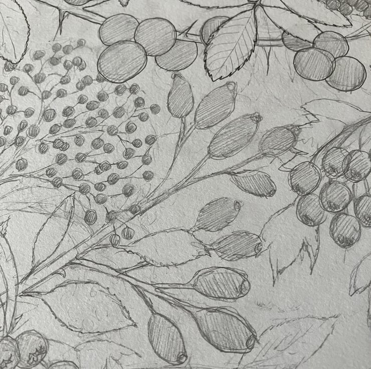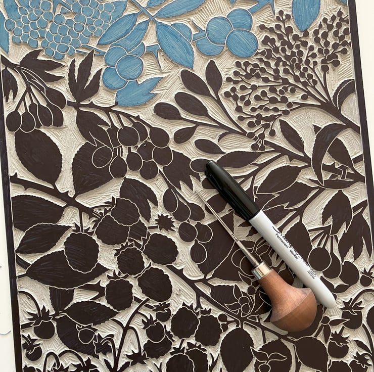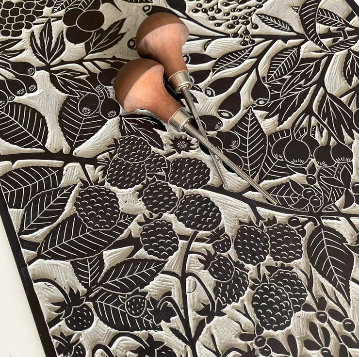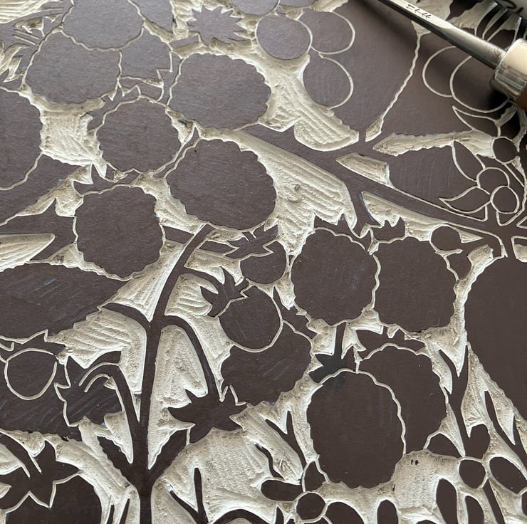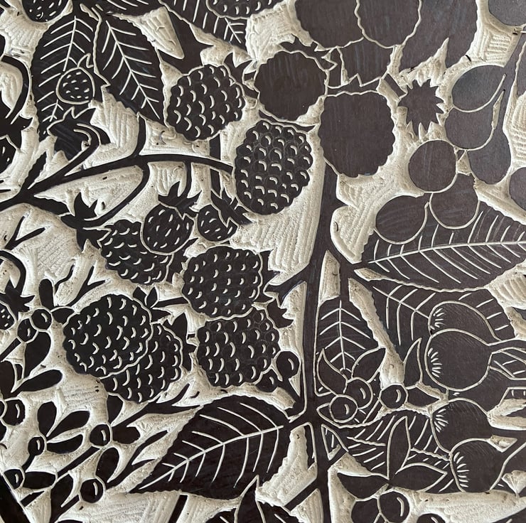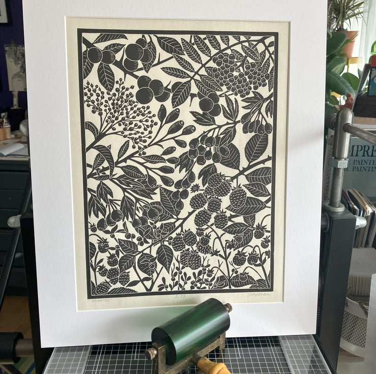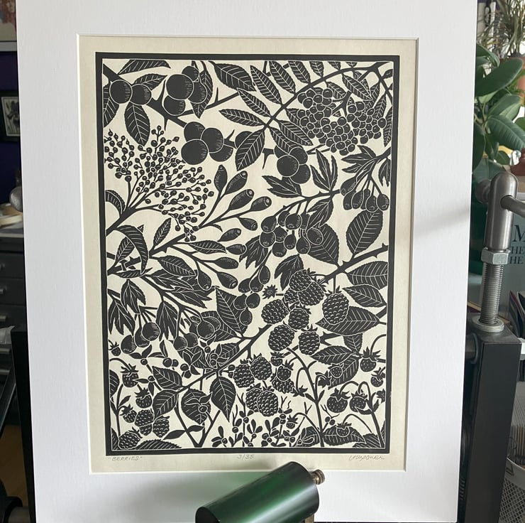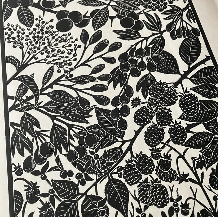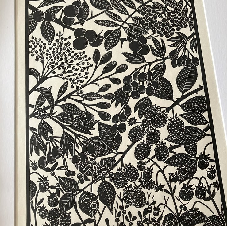 "Berries" is a hand printed, limited edition linocut print of berries and hips. This print is created from my original drawing which is transferred to the lino block in reverse and then carved by hand. Ink is then rolled onto the block and the paper laid onto the inked surface. The print is then rolled through my etching press and hand burnished to capture every detail and the paper lifted from the block to reveal the print.