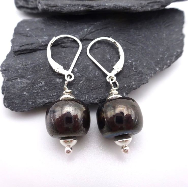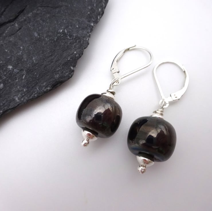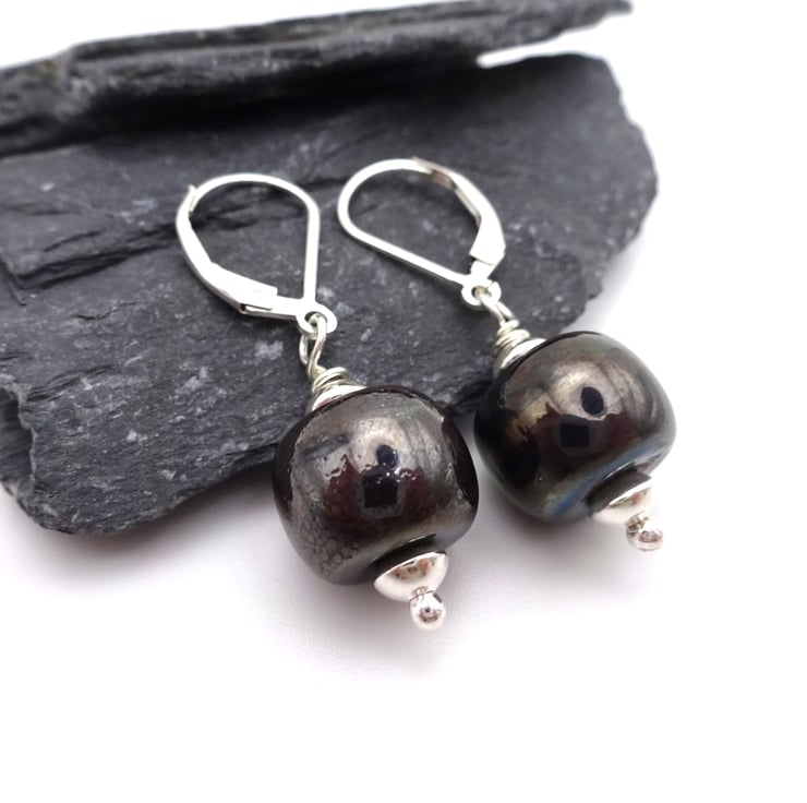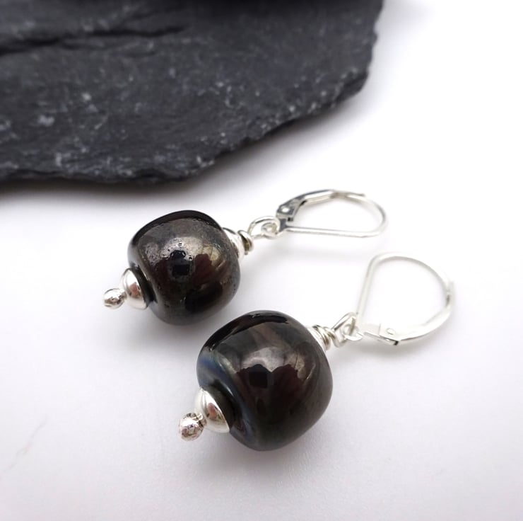 They feature handmade lampwork metallic grey glass beads strung onto sterling silver lever back ear wires.