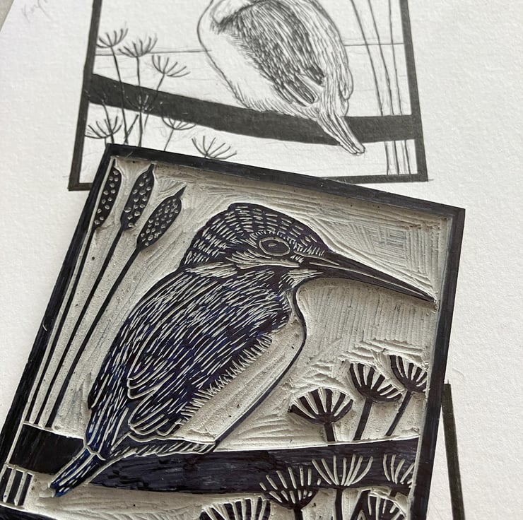 "Kingfisher" is created using the relief printmaking method of linocut printing. In addition I hand colour each print with watercolour, as each print is created by hand there may be tiny variations which add to the individual beauty of each original artwork. "Kingfisher is printed onto Okawara Pro Roll 70gsm Japanese printmaking paper from Awagami Factory.