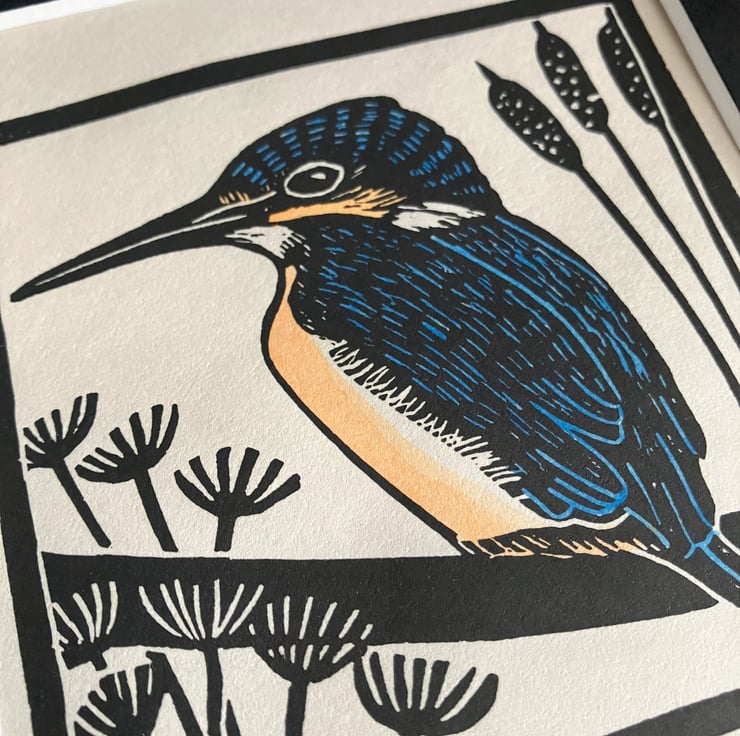 "Kingfisher" is created using the relief printmaking method of linocut printing. In addition I hand colour each print with watercolour, as each print is created by hand there may be tiny variations which add to the individual beauty of each original artwork. "Kingfisher is printed onto Okawara Pro Roll 70gsm Japanese printmaking paper from Awagami Factory.