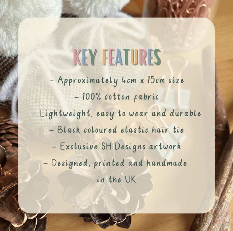 These cute bow hair ties are made from high-quality, durable cotton fabric, feature exclusive SH Designs artwork, and have been designed to add a little bit of colour to you hairstyle. The fabric covered hair band is comfortable to wear - they're the perfect addition to your own hair, or a great wee gift for a friend or family member!