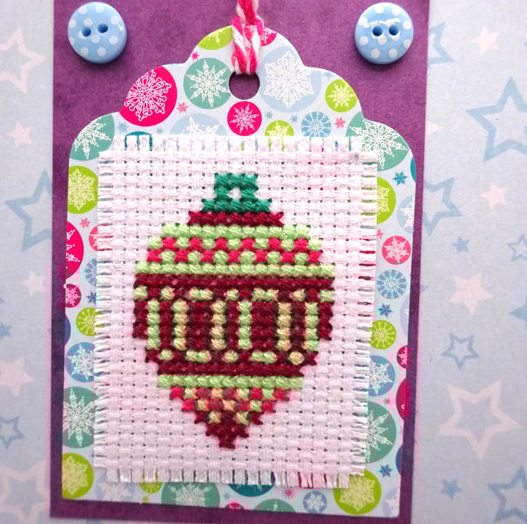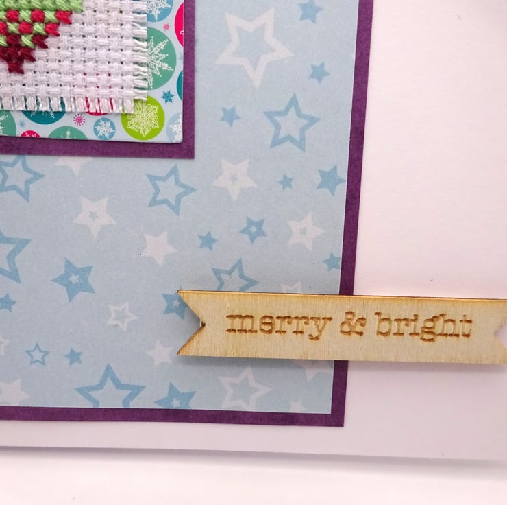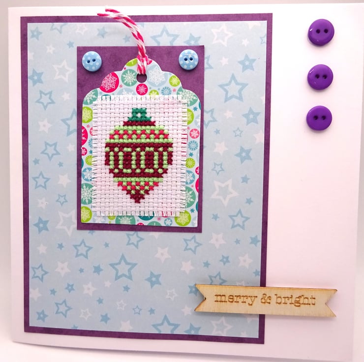 A Christmas card which features a cross stitched image of a bauble with matching papers and the words 'Merry and Bright'.