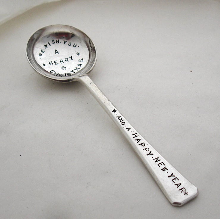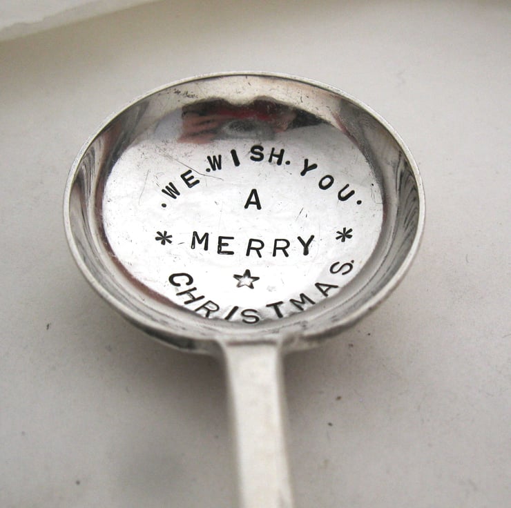 A neat little vintage sauce ladle with a round bowl and flat flared handle with angled corners, hand stamped in the bowl with WE WISH YOU A MERRY CHRISTMAS and along the handle with AND A HAPPY NEW YEAR. This would make a really nice little gift or addition to your festive table, to be brought out and polished up every year. Or perhaps you could add it to a Xmas hamper or a jar of home made cranberry sauce...