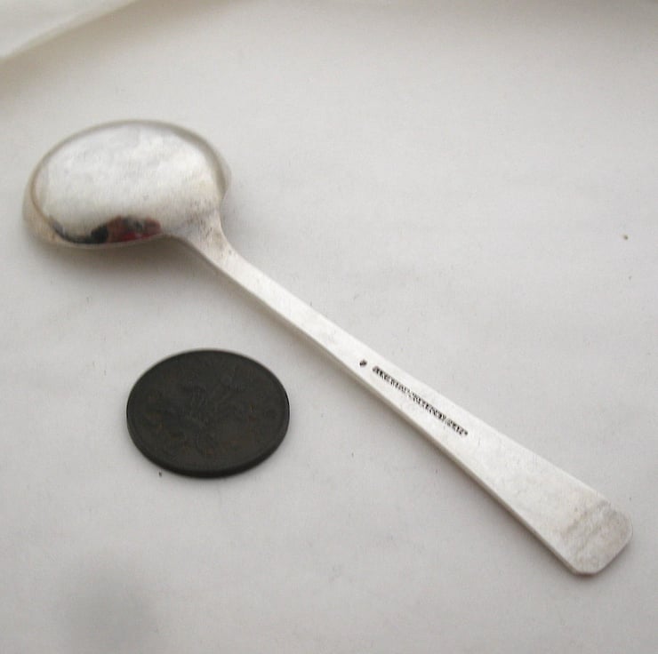 The ladle measures approx. 13cm long and is silver-plated (EPNS). From the style I'd guess it dates to the 1930s although there isn't much to go on - it's a classic design that would look good with tableware from pretty much any post-Victorian era!