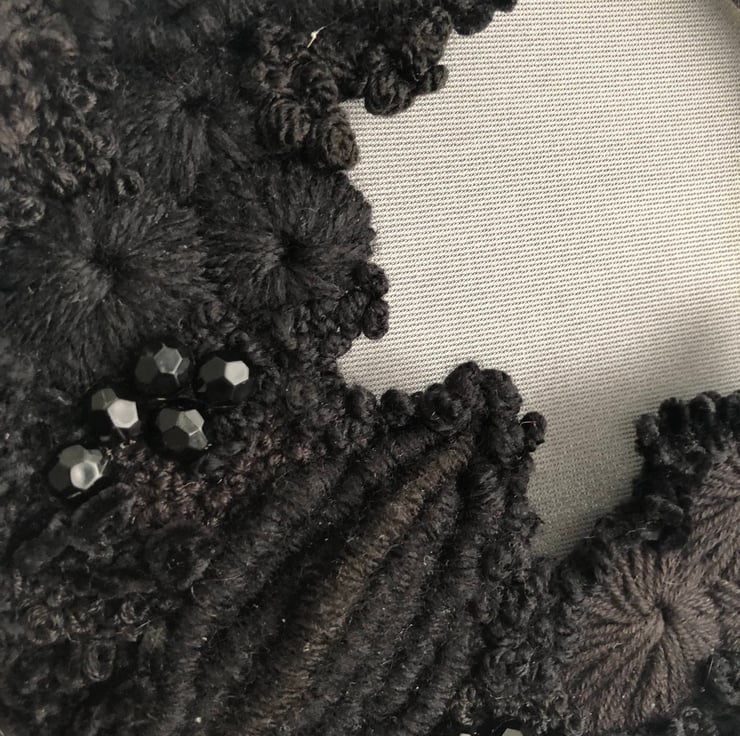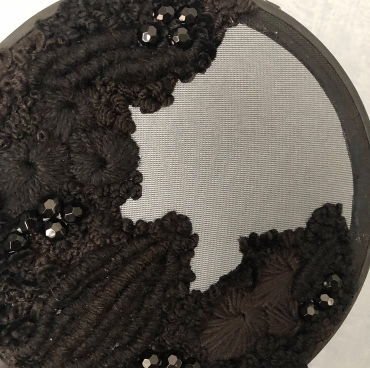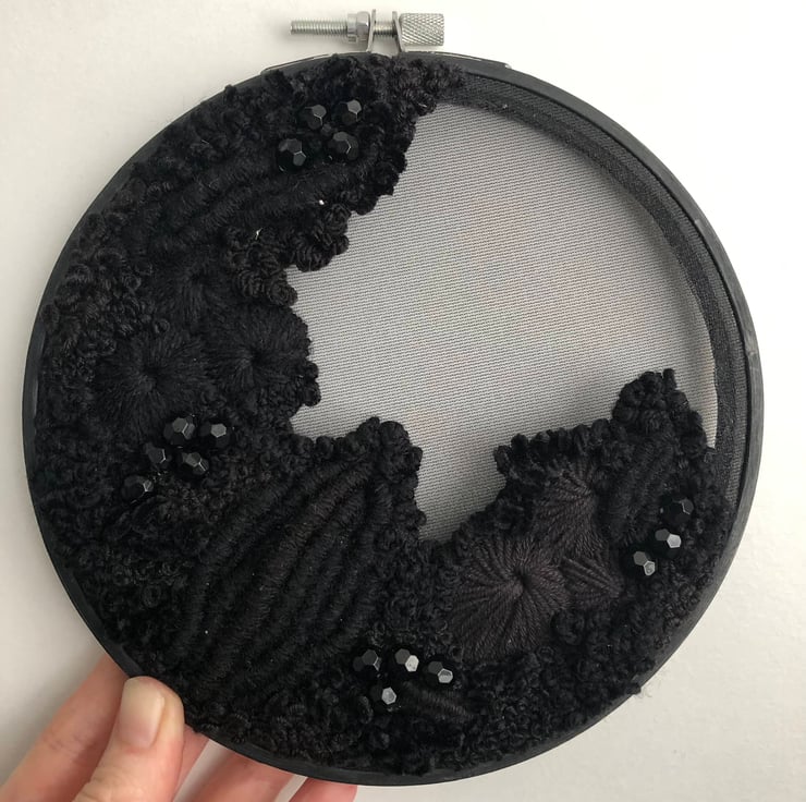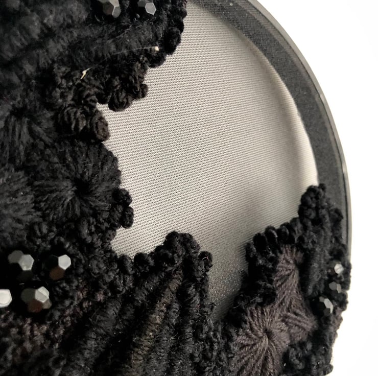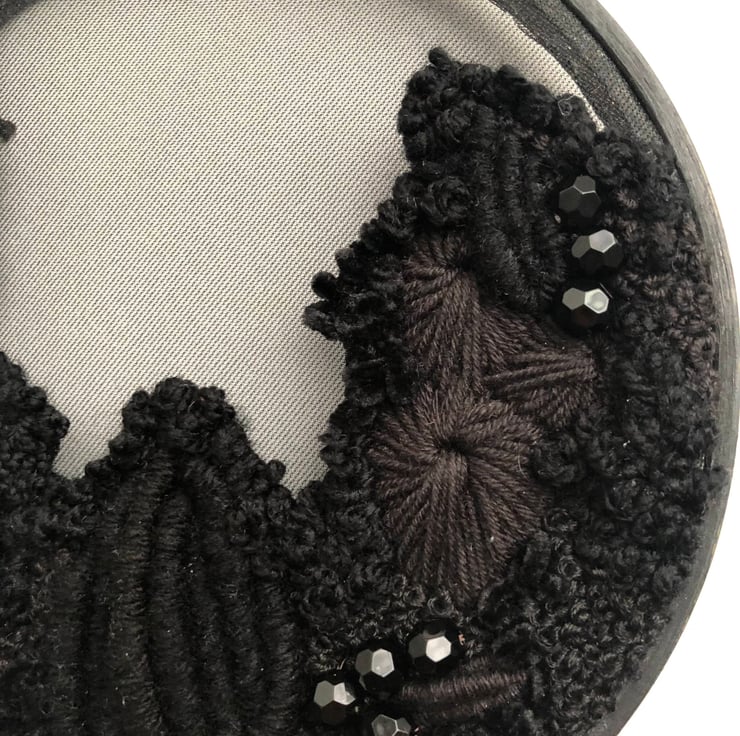The black pearl a one of a kind hand embroidered art piece. Black yarn, embroidery thread and beads have been hand embroidered onto a black organza in an abstract pattern and placed into a hand painted black hoop. This one of a kind art piece is the perfect addition to any home