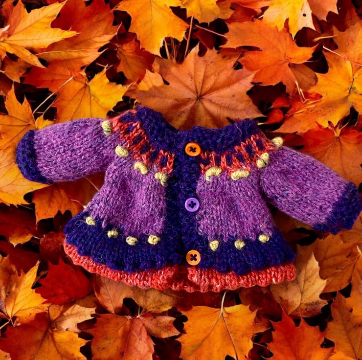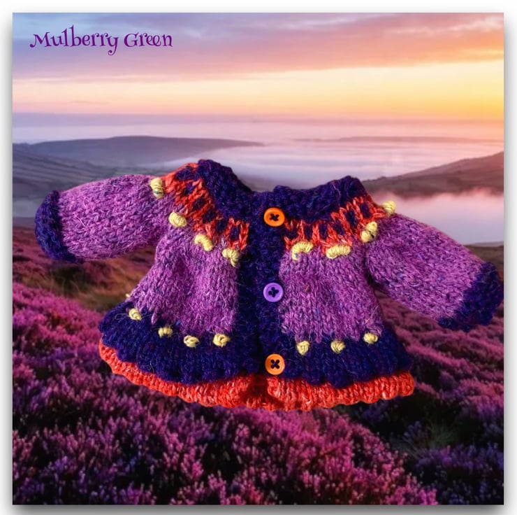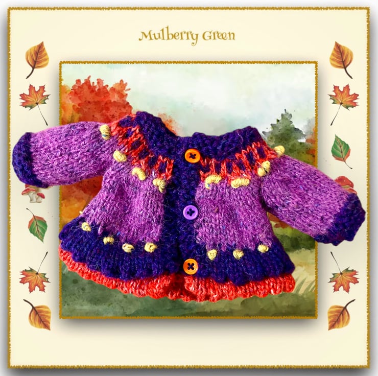 A gorgeous little purple heather and pumpkin double picot edged jacket in Rowan Felted Tweed and Jamieson’s Spindrift, to fit the Mulberry Green characters. The jacket is hand knitted and has a patterned yoke decorated with French knots.