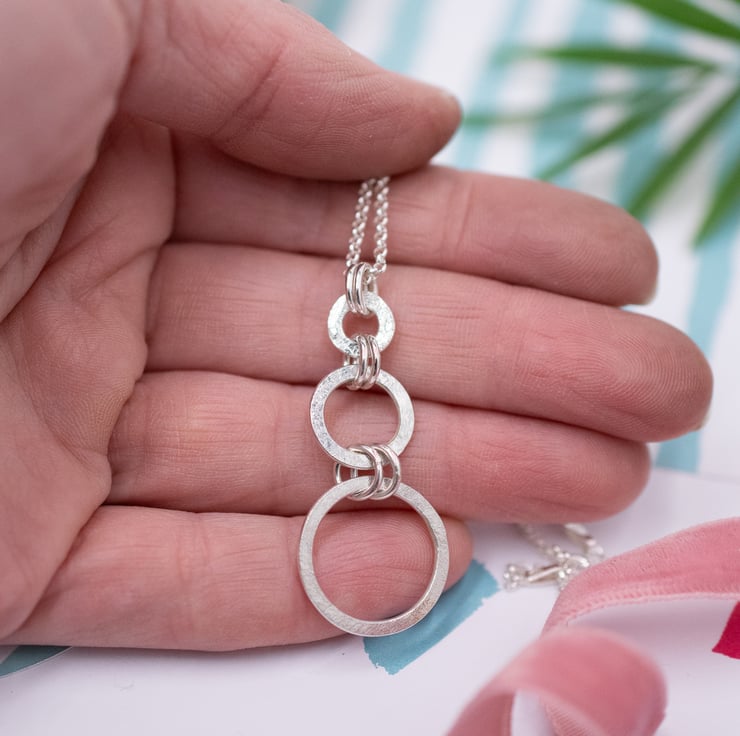 Crafted in solid sterling silver and textured by hand, the necklace has been designed and made by Isobel Robinson with versatility in mind. Its minimalist, contemporary design means you can style with almost any outfit, for any occasion. The pendant measures appoxately 40mm long and is hung from your choice of chain length.