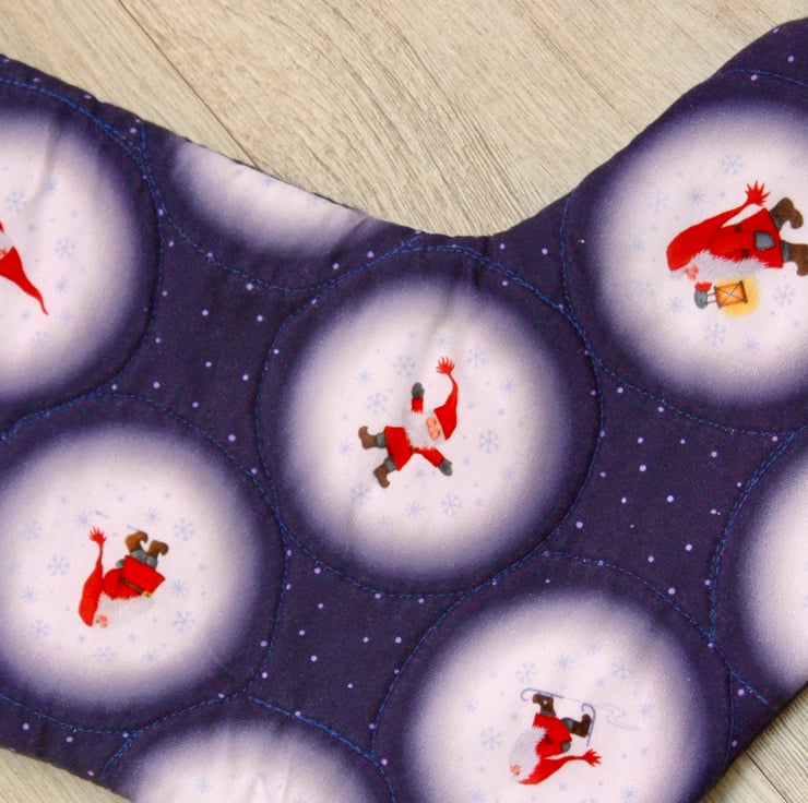 The Stocking is fully lined and made with 100% high quality cotton throughout. The outer layer is a dark blue fabric with scattered Santa's in various poses. The lining and hanging loop are Cream. The layers are quilted in a circles pattern around the Santas with a layer of eco-friendly wadding in the middle made from recycled plastic bottles.