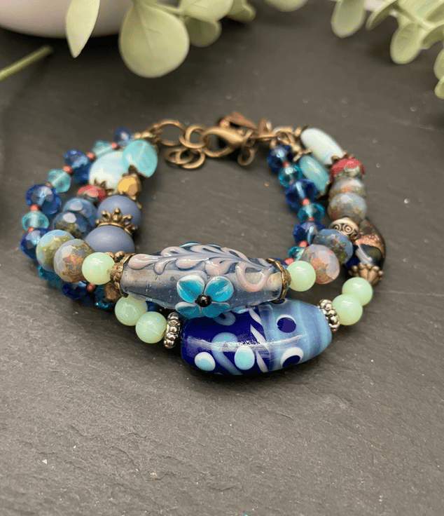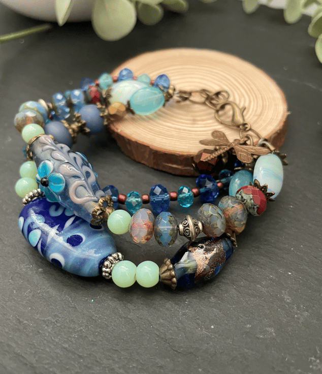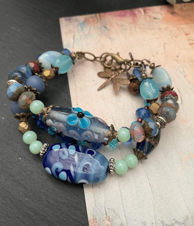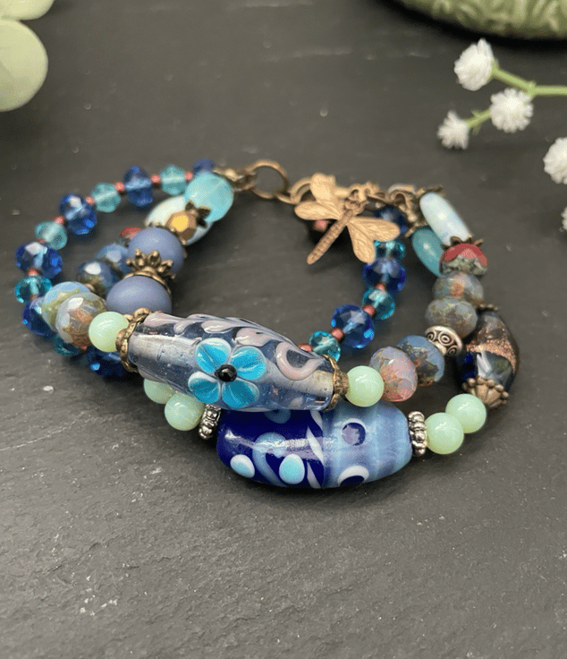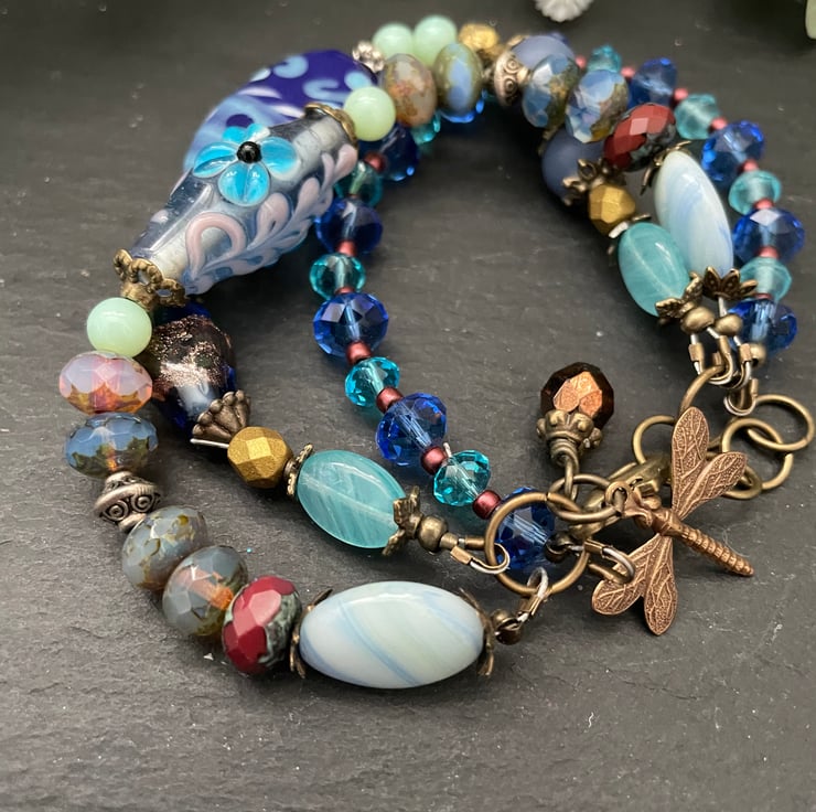 Beautiful shades of blue glass beads create the perfect setting for this unique one of a kind 3 strand Dragonfly bracelet. A gorgeous selection of Lampwork handmade glass beads, Czech fire polished beads,gemstone beads, picasso Czech beads come together beautifully, linked using copper tone bead caps and findings.