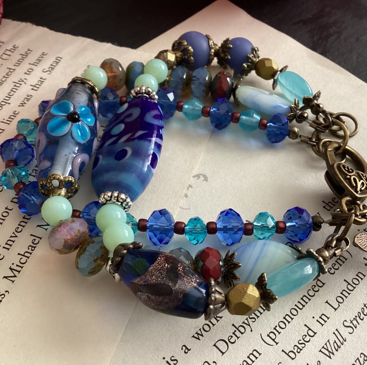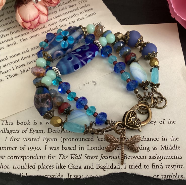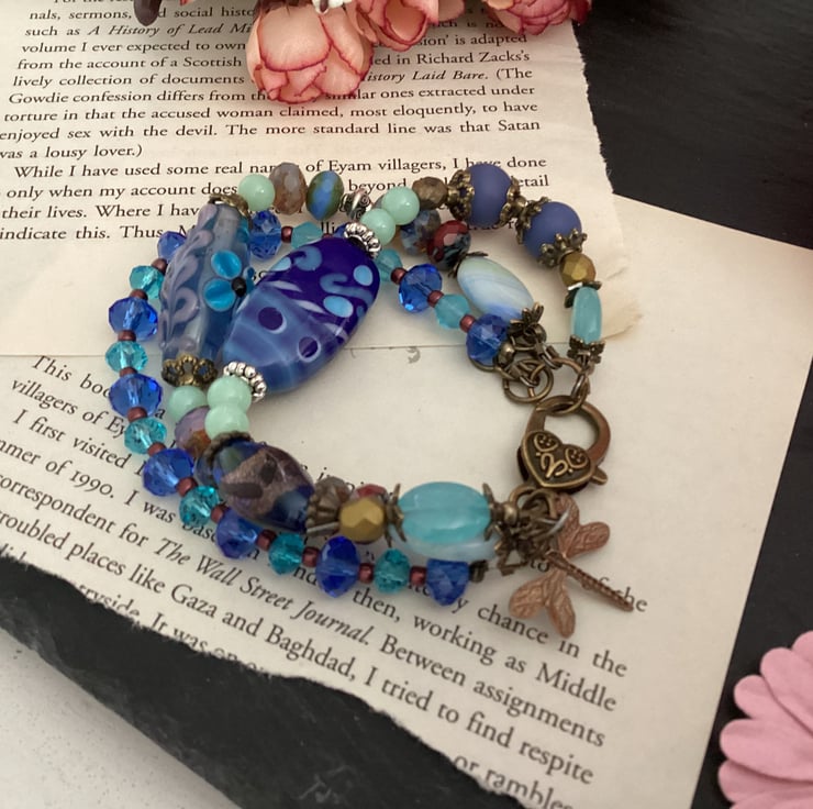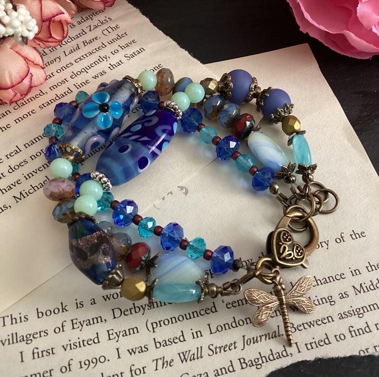 Beautiful shades of blue glass beads create the perfect setting for this unique one of a kind 3 strand Dragonfly bracelet. A gorgeous selection of Lampwork handmade glass beads, Czech fire polished beads,gemstone beads, picasso Czech beads come together beautifully, linked using copper tone bead caps and findings.