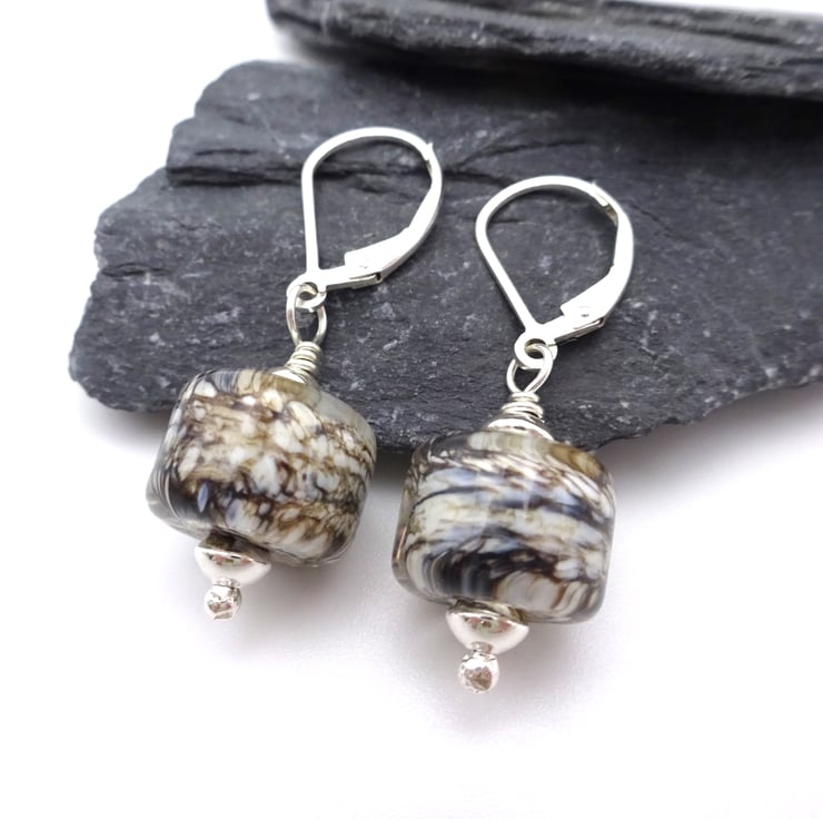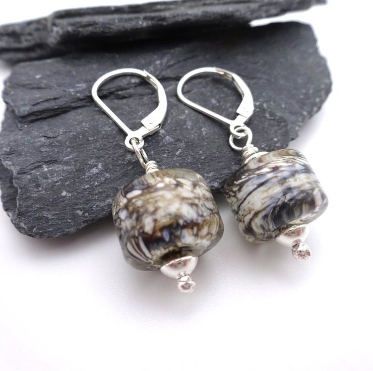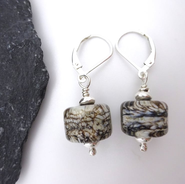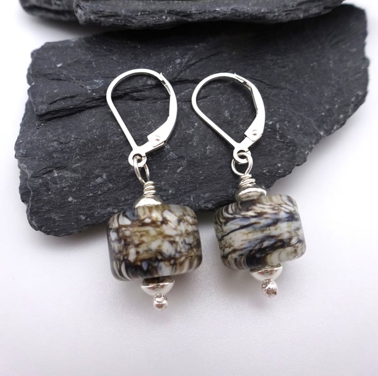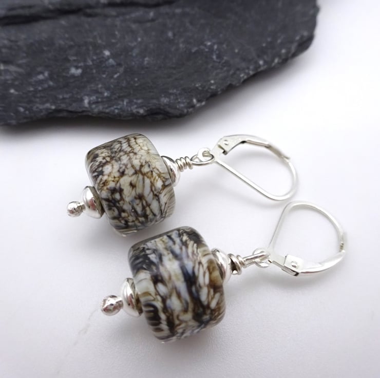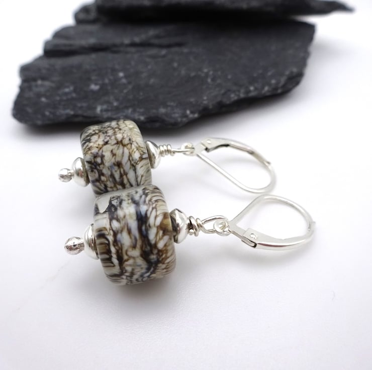 They feature sterling silver lever back ear wires and handmade lampwork ivory and black glass beads.