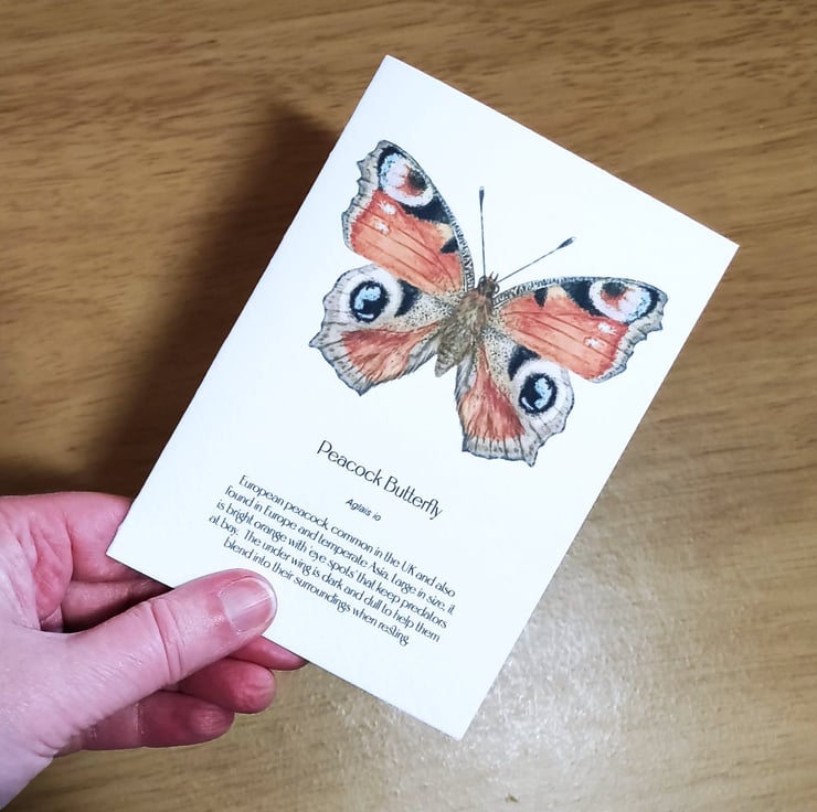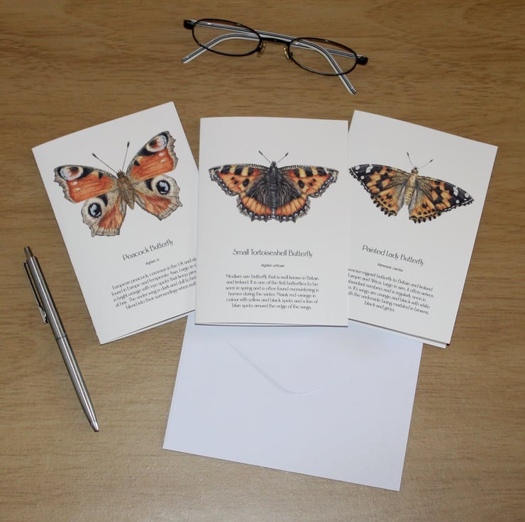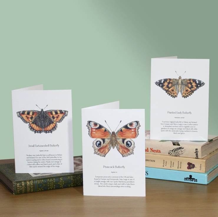 This is a set of three A6 wildlife greetings cards, one each of Peacock, Painted Lady and Small Tortoiseshell butterflies. Each illustration has been taken from my own watercolour nature art and has a little snippet of information about each butterfly on the card. Use them for birthdays, Easter, Christmas or a general thank you note. The set makes a lovely gift for lepidopterists,