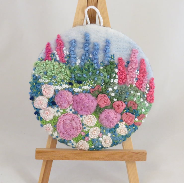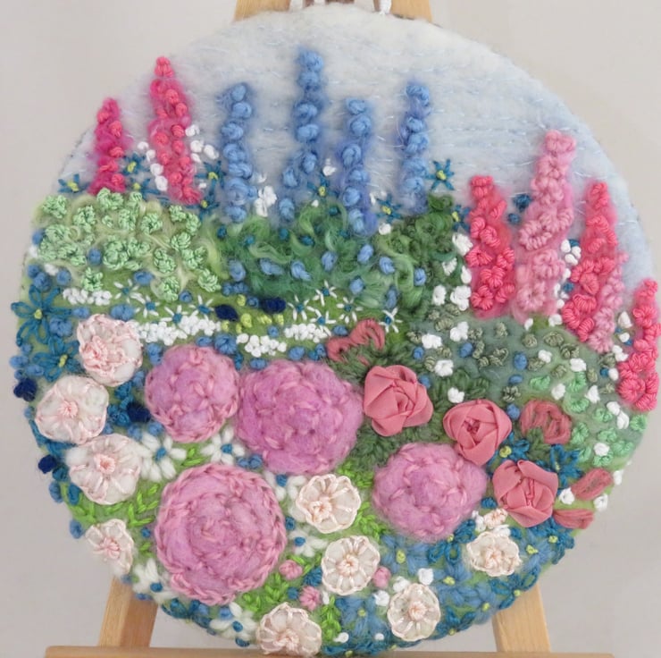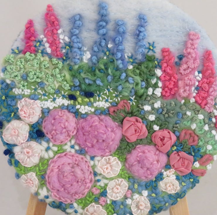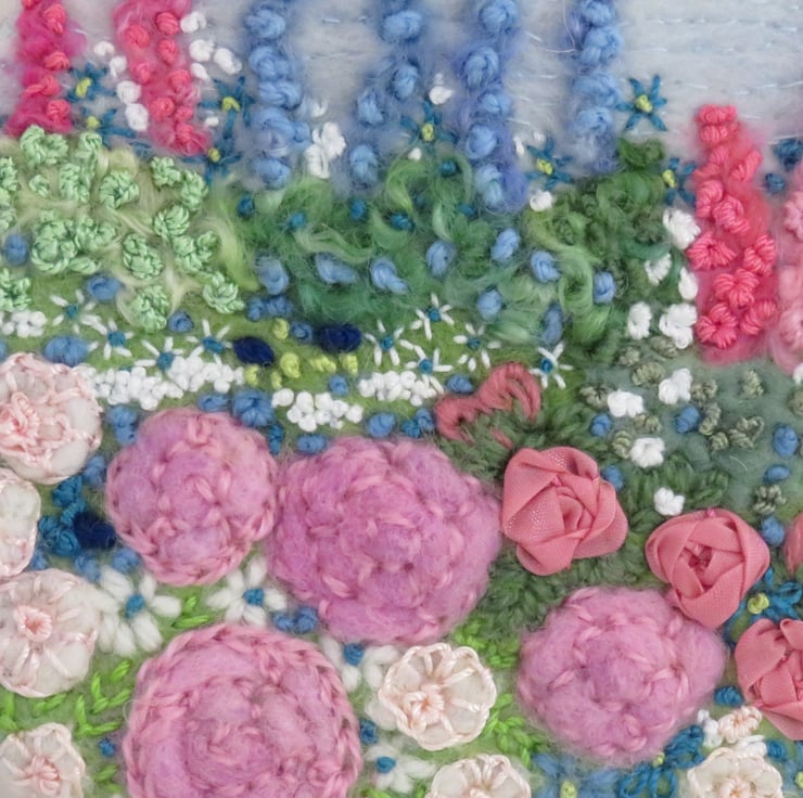 The background of this design has been created by needle felting wool fibres into a scrap of quilt backing. The background has then been stitched to fabric reclaimed from a vintage tablecloth. Details of the design have been added in simple hand embroidery using threads (some of which are vintage) and using vintage 3 ply wool. Some roses have been stitched in silk ribbon.