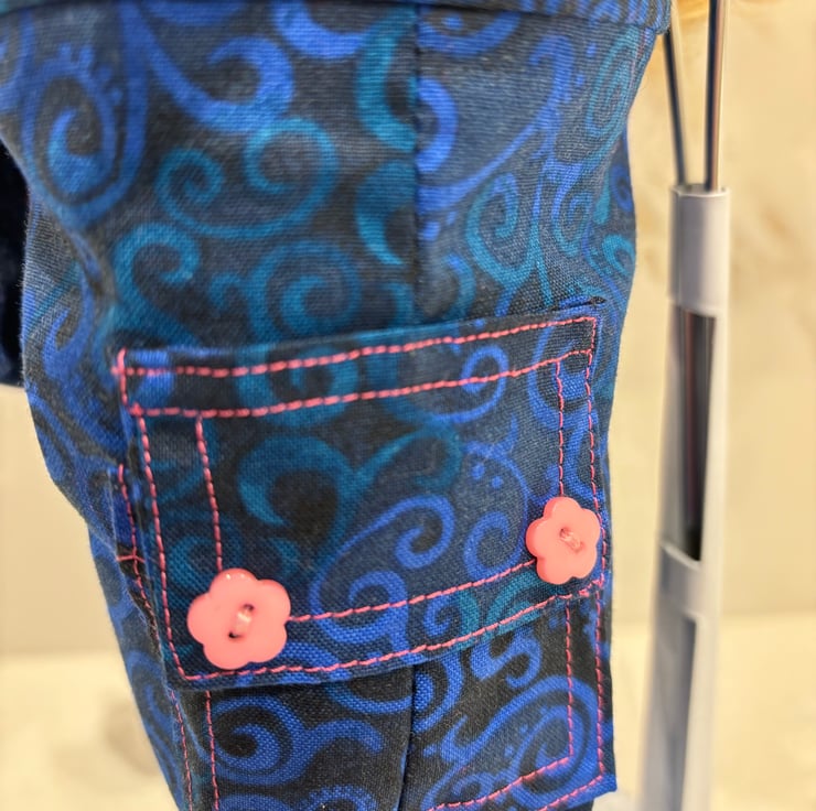 The trouser pockets and top are closed with small buttons and snap fasteners. Suitable for children over 3 years. Small parts.