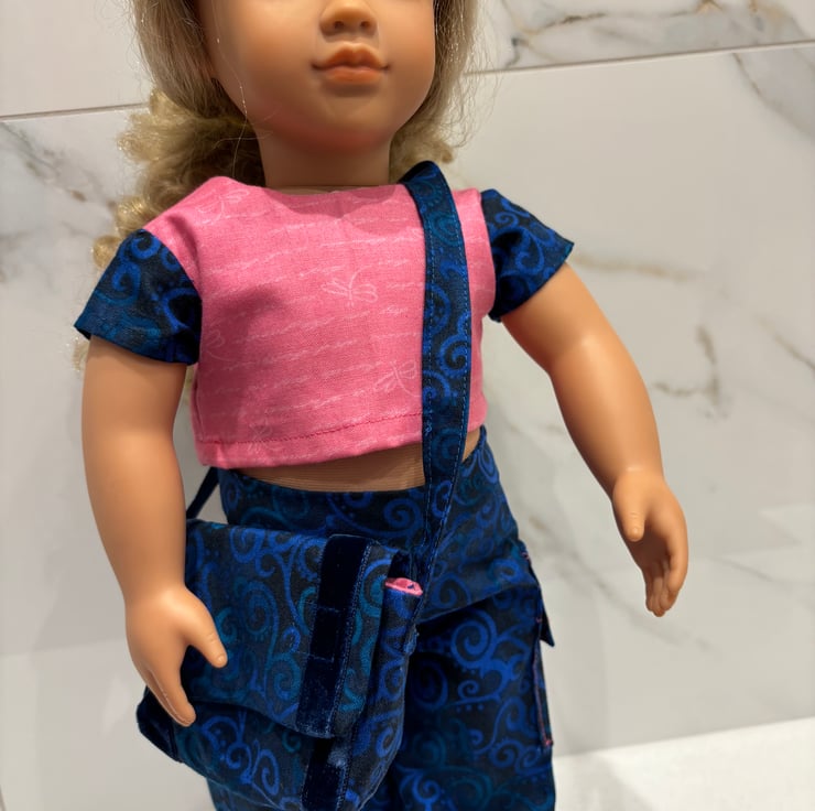The set includes cargo trousers with functional side leg pockets, cropped style trousers and shoulder bag. The bag opens and small items can be put inside.