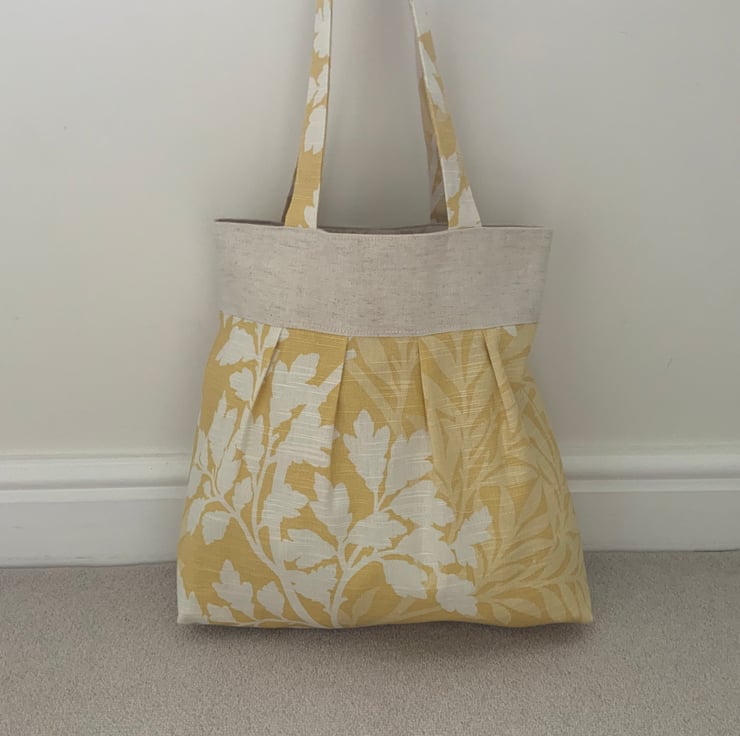 Beautiful pleated tote bag. Natural linen band at top with a pleated floral fabric beneath. Lined with natural cotton fabric with a layer of interlining sandwiched in between to give it a little structure. Internally, it has a small slip pocket and is fitted with a magnetic snap fastener. The square bottom gives the bag extra depth.